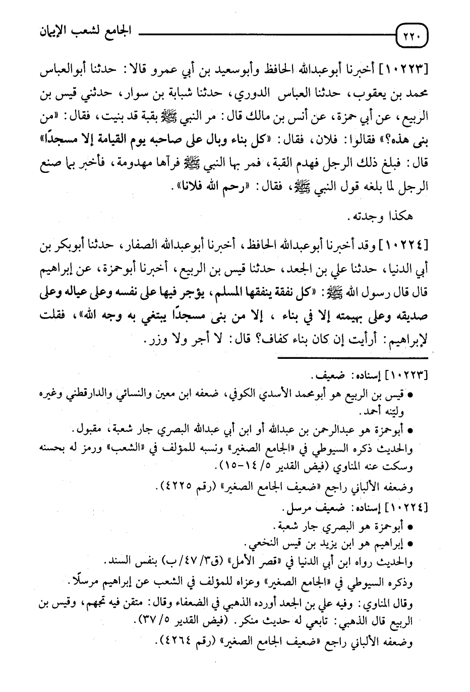 10223 - أَخْبَرَنَا أَبُو عَبْدِ اللهِ الْحَافِظُ، وَأَبُو سَعِيدِ بْنُ أَبِي عَمْرٍو، قَالَا: نَا أَبُو الْعَبَّاسِ مُحَمَّدُ بْنُ يَعْقُوبَ، نَا الْعَبَّاسُ الدُّورِيُّ، نَا شَبَابَةُ بْنُ سَوَّارٍ، حَدَّثَنِي قَيْسُ بْنُ الرَّبِيعِ، عَنْ أَبِي حَمْزَةَ، عَنْ أَنَسِ بْنِ مَالِكٍ، قَالَ: مَرَّ النَّبِيُّ صَلَّى اللَّهُ عَلَيْهِ وَسَلَّمَ بِقُبَّةٍ قَدْ بُنِيَتْ فَقَالَ: " مَنْ بَنَى هَذِهِ؟ " فَقَالُوا: فُلَانٌ، فَقَالَ: §" كُلُّ بِنَاءٍ وَبَالٌ عَلَى صَاحِبِهِ يَوْمَ الْقِيَامَةِ إِلَّا مَسْجِدًا " قَالَ: فَبَلَغَ ذَلِكَ الرَّجُلَ فَهَدَمَ الْقُبَّةَ، فَمَرَّ بِهَا النَّبِيُّ صَلَّى اللَّهُ عَلَيْهِ وَسَلَّمَ فَرَآهَا مَهْدُومَةً فَأُخْبِرَ بِمَا صَنَعَ الرَّجُلُ لَمَّا بَلَغَهُ قَوْلُ النَّبِيِّ صَلَّى اللَّهُ عَلَيْهِ وَسَلَّمَ فَقَالَ: " رَحِمَ اللهُ فُلَانًا ". " هَكَذَا وَجَدْتُهُ "