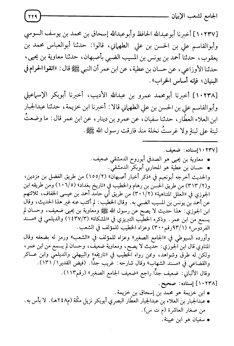 10237 - أَخْبَرَنَا أَبُو عَبْدِ اللهِ الْحَافِظُ، وَأَبُو عَبْدِ اللهِ إِسْحَاقُ بْنُ مُحَمَّدِ بْنِ يُوسُفَ السُّوسِيُّ، وَأَبُو الْقَاسِمِ عَلِيُّ بْنُ الْحَسَنِ بْنِ عَلِيٍّ الطَّهْمَانِيُّ، قَالُوا: نَا أَبُو الْعَبَّاسِ مُحَمَّدُ بْنُ يَعْقُوبَ، نَا أَحْمَدُ بْنُ يُونُسَ بْنِ الْمُسَيِّبِ الضَّبِّيُّ بأَصْبَهَانَ، نَا مُعَاوِيَةُ بْنُ يَحْيَى، نَا الْأَوْزَاعِيُّ، عَنْ حَسَّانِ بْنِ عَطِيَّةَ، عَنِ ابْنِ عُمَرَ، أَنَّ النَّبِيَّ صَلَّى اللَّهُ عَلَيْهِ وَسَلَّمَ، قَالَ: " §اتَّقُوا الْحَرَامَ فِي الْبُنْيَانِ، فَإِنَّهُ أَسَاسُ الْخَرَابِ "