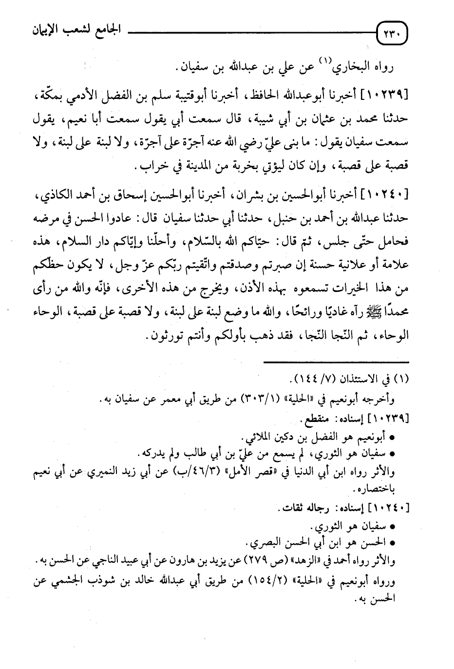 10239 - أَخْبَرَنَا أَبُو عَبْدِ اللهِ الْحَافِظُ، أَنَا أَبُو قُتَيْبَةَ سَالِمُ بْنُ الْفَضْلِ الْأَدَمِيُّ بِمَكَّةَ، نَا مُحَمَّدُ بْنُ عُثْمَانَ بْنِ أَبِي شَيْبَةَ، قَالَ: سَمِعْتُ أَبِي يَقُولُ: سَمِعْتُ أَبَا نُعَيْمٍ يَقُولُ: سَمِعْتُ سُفْيَانَ يَقُولُ: " §مَا بَنَى عَلِيٌّ رَضِيَ اللهُ عَنْهُ أَجُرَّةً عَلَى أَجُرَّةٍ، وَلَا لَبِنَةً عَلَى لَبِنَةٍ، وَلَا قَصَبَةً، وَإِنْ كَانَ لِيُؤْتَى مِنَ الْمَدِينَةِ فِي خَرَابٍ "