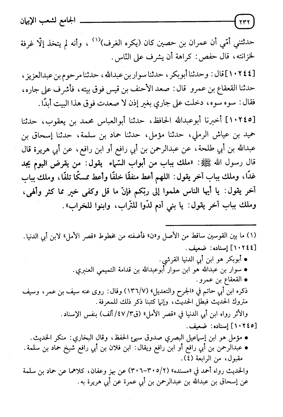 10245 - أَخْبَرَنَا أَبُو عَبْدِ اللهِ الْحَافِظُ، نَا أَبُو الْعَبَّاسِ مُحَمَّدُ بْنُ يَعْقُوبَ، نَا حُمَيْدُ بْنُ عَيَّاشٍ الرَّمْلِيُّ، نَا مُؤَمَّلٌ، نَا حَمَّادُ بْنُ سَلَمَةَ، نَا إِسْحَاقُ بْنُ عَبْدِ اللهِ بْنِ أَبِي طَلْحَةَ، عَنْ عَبْدِ الرَّحْمَنِ بْنِ أَبِي رَافِعٍ، أَوِ ابْنِ رَافِعٍ، عَنْ أَبِي هُرَيْرَةَ، قَالَ: قَالَ رَسُولُ اللهِ صَلَّى اللَّهُ عَلَيْهِ وَسَلَّمَ: " §مَلَكٌ بِبَابٍ مِنْ أَبْوَابِ السَّمَاءِ يَقُولُ: مَنْ يُقْرِضِ الْيَوْمَ يَجِدْ غَدًا، وَمَلَكٌ بِبَابٍ آخَرَ يَقُولُ: اللهُمَّ أَعْطِ مُنْفِقًا خَلَفًا، وَأَعْطِ مُمْسِكًا تَلَفًا، وَمَلَكٌ بِبَابٍ آخَرَ يَقُولُ: يَا أَيُّهَا النَّاسُ هَلُمُّوا إِلَى رَبِّكُمْ، فَإِنَّ مَا قَلَّ وَكَفَى خَيْرٌ مِمَّا كَثُرَ وَأَلْهَى، وَمَلَكٌ بِبَابٍ آخَرَ يَقُولُ: يَا بَنِي آدَمَ لِدُوا لِلتُّرَابِ، وَابْنُوا لِلْخَرَابِ "
