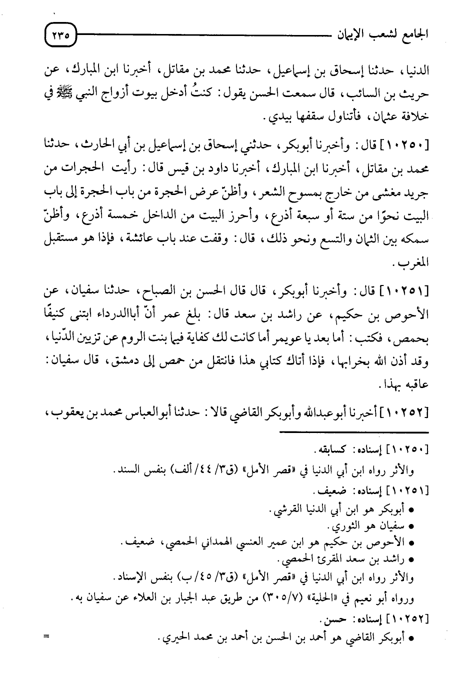 10251 - قَالَ: وَأَنَا أَبُو بَكْرٍ، قَالَ: قَالَ الْحَسَنُ بْنُ الصَّبَّاحِ: نَا سُفْيَانُ، عَنِ الْأَحْوَصِ بْنِ حَكِيمٍ، عَنْ رَاشِدِ بْنِ سَعْدٍ، قَالَ: بَلَغَ عُمَرَ أَنَّ أَبَا الدَّرْدَاءِ §ابْتَنَى كَنِيفًا بِحِمْصَ، فَكَتَبَ: " أَمَّا بَعْدُ يَا عُوَيْمِرُ أَمَا كَانَتْ لَكَ كِفَايَةٌ فِيمَا بَنَتِ الرُّومُ عَنْ تَزْيِينِ الدُّنْيَا، وَقَدْ أَذِنَ اللهُ بِخَرَابِهَا، فَإِذَا أَتَاكَ كِتَابِي هَذَا، فَانْتَقِلْ مِنْ حِمْصَ إِلَى دِمَشْقَ ". قَالَ سُفْيَانُ: " عَاقَبَهُ بِهَذَا "