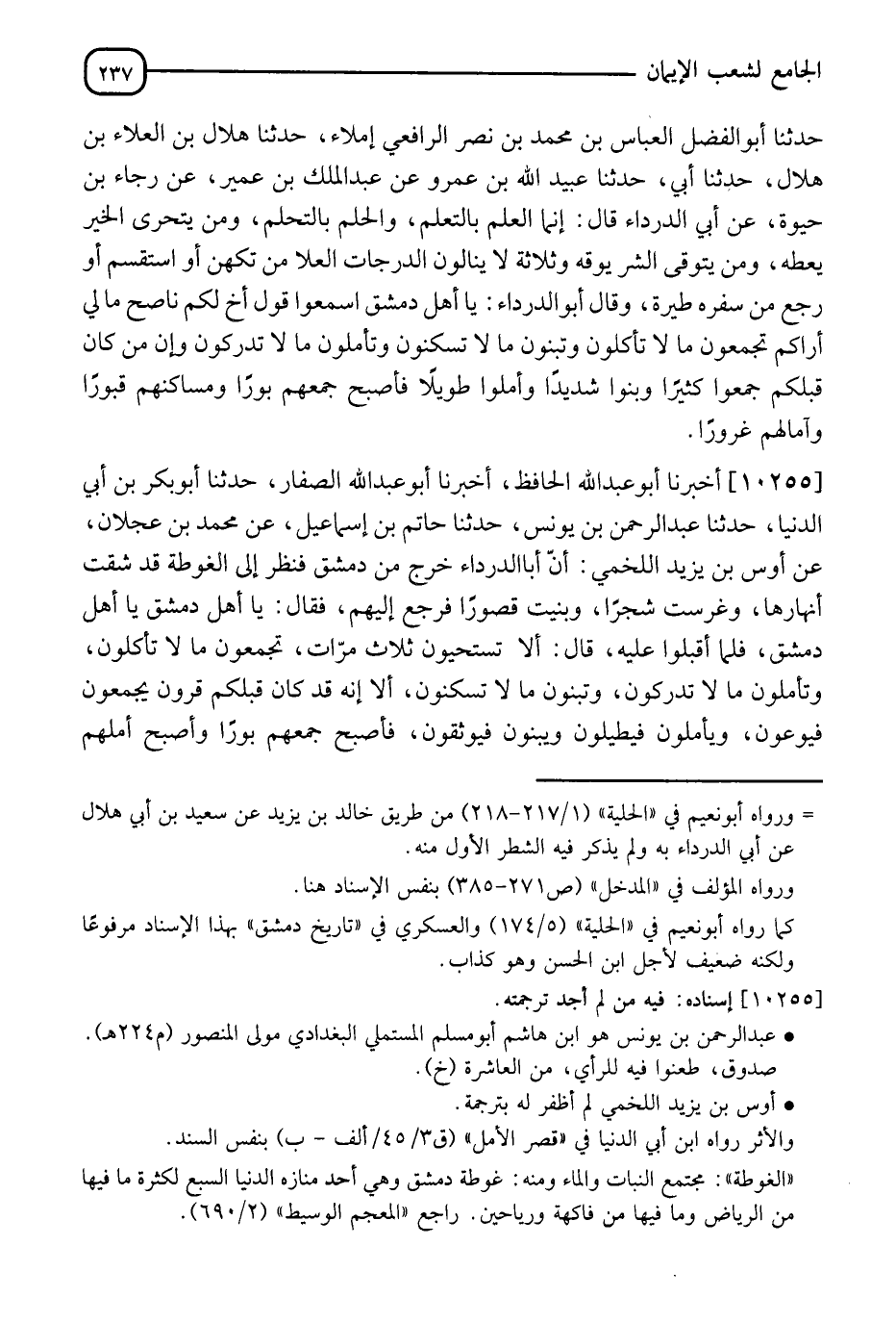 10255 - أَخْبَرَنَا أَبُو عَبْدِ اللهِ الْحَافِظُ، نَا أَبُو عَبْدِ اللهِ الصَّفَّارُ، نَا أَبُو بَكْرِ بْنُ أَبِي الدُّنْيَا، نَا عَبْدُ الرَّحْمَنِ بْنُ يُونُسَ، نَا حَاتِمُ بْنُ إِسْمَاعِيلَ، عَنْ مُحَمَّدِ بْنِ عَجْلَانَ، عَنْ أَوْسِ بْنِ يَزِيدَ اللَّخْمِيُّ، أَنَّ أَبَا الدَّرْدَاءِ خَرَجَ مِنْ دِمَشْقَ، فَنَظَرَ إِلَى الْغُوطَةِ قَدْ سَقَتْ أَنْهَارُهَا، وَغُرِسَتْ شَجَرًا، وَبُنِيَتْ قُصُورًا، فَرَجَعَ إِلَيْهِمْ، فَقَالَ: " يَا أَهْلَ دِمَشْقَ ". فَلَمَّا أَقْبَلُوا عَلَيْهِ قَالَ: " أَلَا تَسْتَحْيُونَ - ثَلَاثَ مَرَّاتٍ - تَجْمَعُونَ مَا لَا تَأْكُلُونَ، وَتُؤَمِّلُونَ مَا لَا تُدْرِكُونَ، وَتَبْنُونَ مَا لَا تَسْكُنُونَ، أَلَا إِنَّهُ قَدْ §كَانَ قَبْلَكُمْ قُرُونٌ يَجْمَعُونَ فَيُوعُونَ، وَيُؤَمِّلُونَ فَيُطِيلُونِ، وَيَبْنُونَ فَيُوثِقُونَ، فَأَصْبَحَ جَمْعُهُمْ بُورًا، وَأَصْبَحَ أَمَلُهُمْ -[238]- غُرُورًا، وَأَصْبَحَتْ مَنَازِلُهُمْ قُبُورًا، أَلَا إِنَّ عَادًا مَلَكَتْ مَا بَيْنَ عَدَنَ وَعَمَّانَ نَعْمَاءَ وَأَمْوَالًا، فَمَنْ يَشْتَرِي مِنِّي مَالَ عَادٍ بِدِرْهَمَيْنِ "