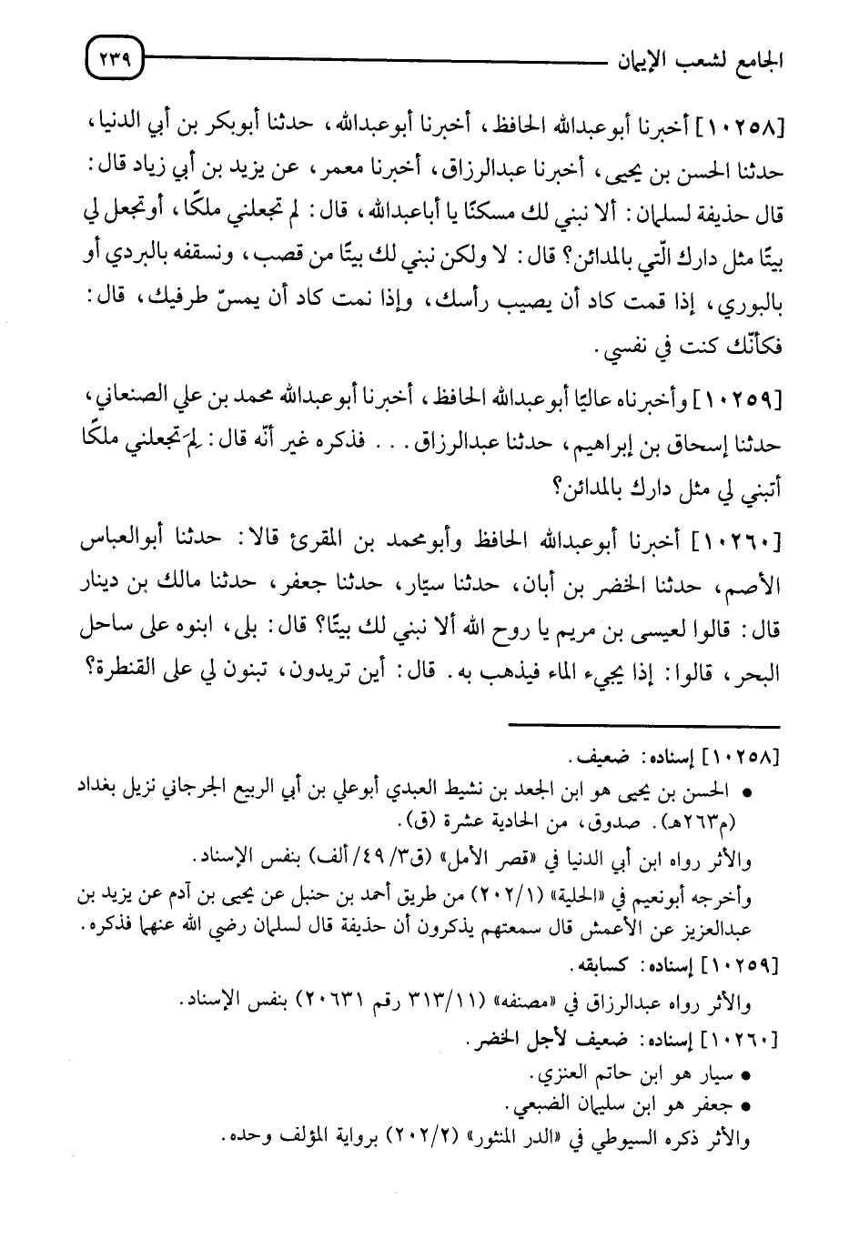 10260 - أَخْبَرَنَا أَبُو عَبْدِ اللهِ الْحَافِظُ، وَأَبُو مُحَمَّدِ بْنُ الْمُقْرِئِ قَالَا: نَا أَبُو الْعَبَّاسِ الْأَصَمُّ، نَا الْخَضِرُ بْنُ أَبَانَ، نَا سَيَّارٌ، نَا جَعْفَرٌ، نَا مَالِكُ بْنُ دِينَارٍ قَالَ: " §قَالُوا لِعِيسَى ابنِ مَرْيَمَ: يَا رَوْحَ اللهِ أَلَا نَبْنِي لَكَ بَيْتًا؟، قَالَ: بَلَى ابْنُوهُ عَلَى سَاحِلِ الْبَحْرِ. قَالُوا: إِذًا يَجِيءُ الْمَاءُ فَيَذْهَبُ بِهِ. قَالَ: أَيْنَ تُرِيدُونَ تَبْنُونَ لِي عَلَى الْقَنْطَرَةِ؟ "