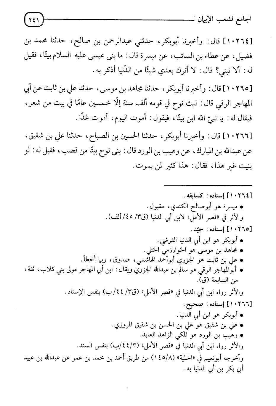 10266 - قَالَ: وَأَنَا أَبُو بَكْرٍ، نَا الْحُسَيْنُ بْنُ الصَّبَّاحِ، نَا عَلِيُّ بْنُ شَقِيقٍ، عَنْ عَبْدِ اللهِ بْنِ الْمُبَارَكِ، عَنْ وُهَيْبِ بْنِ الْوَرْدِ قَالَ: " §بَنَى نُوحٌ بَيْتًا مِنْ قَصَبٍ، فَقِيلَ لَهُ: لَوْ بَنَيْتَ غَيْرَ هَذَا، فَقَالَ: هَذَا كَثِيرٌ لِمَنْ يَمُوتُ "