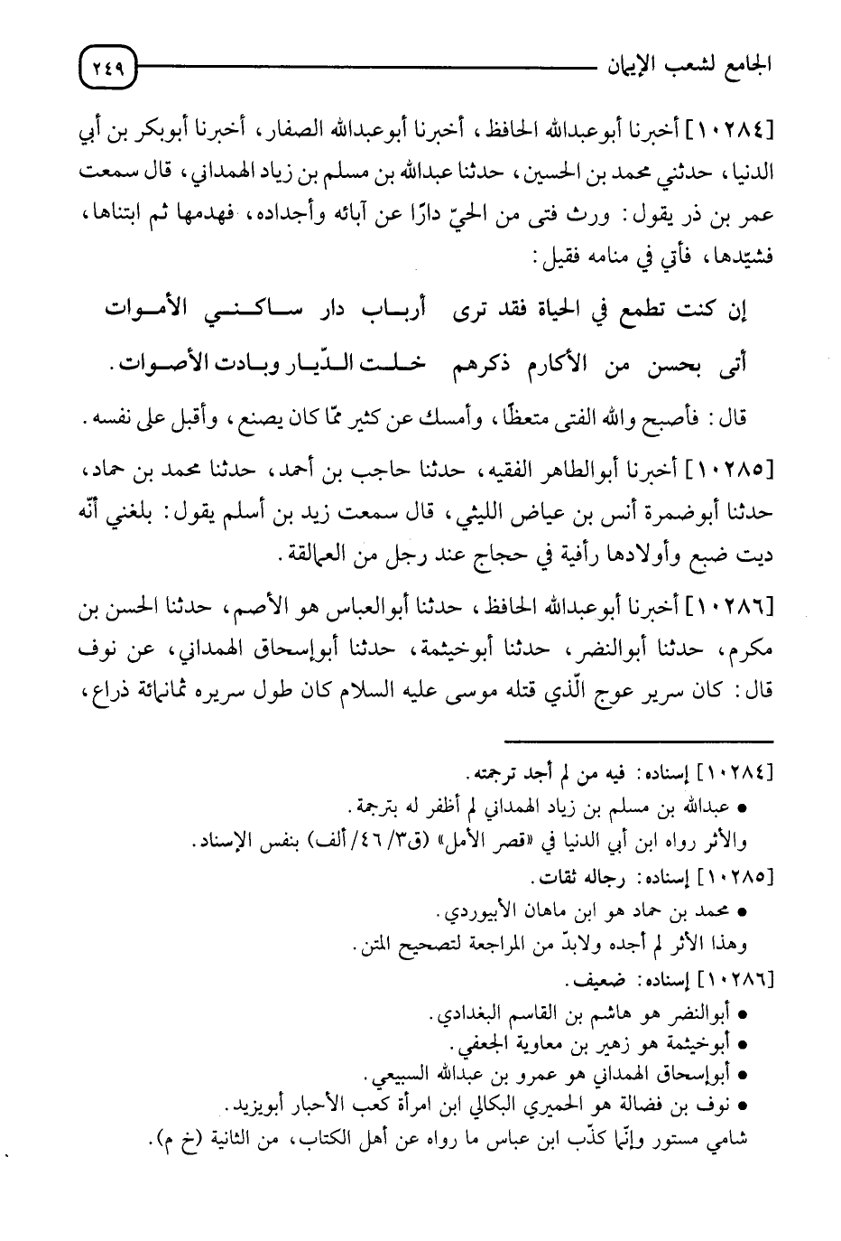 10284 - أَخْبَرَنَا أَبُو عَبْدِ اللهِ الْحَافِظُ، أَنَا أَبُو عَبْدِ اللهِ الصَّفَّارُ، نَا أَبُو بَكْرِ بْنُ أَبِي الدُّنْيَا، حَدَّثَنِي مُحَمَّدُ بْنُ الْحُسَيْنِ، نَا عَبْدُ اللهِ بْنُ مُسْلِمِ بْنِ زِيَادٍ الْهَمْدَانِيُّ قَالَ: سَمِعْتُ عُمَرَ بْنَ ذَرٍّ يَقُولُ:" §وَرِثَ فَتًى مِنَ الْحَيِّ دَارًا عَنْ آبَائِهِ وَأَجْدَادِهِ فَهَدَمَهَا، ثُمَّ ابْتَنَاهَا فَشَيَّدَهَا، فَأُتِيَ فِي مَنَامِهِ فَقِيلَ لَهُ: