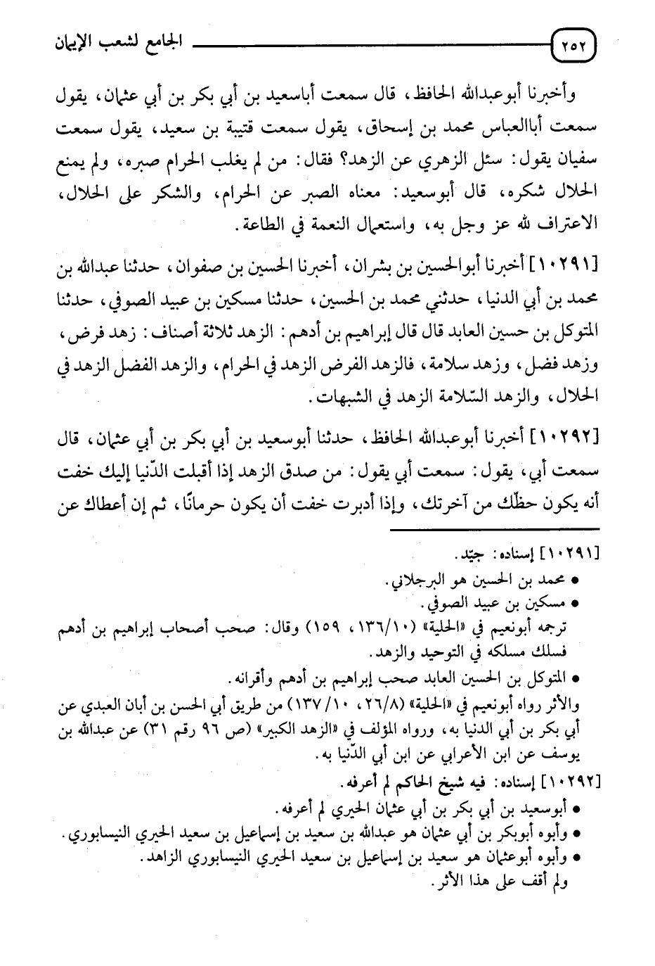 10291 - أَخْبَرَنَا أَبُو الْحُسَيْنِ بْنُ بُشْرَانَ، نَا الْحُسَيْنُ بْنُ صَفْوَانَ، نَا عَبْدُ اللهِ بْنُ مُحَمَّدِ بْنِ أَبِي الدُّنْيَا، حَدَّثَنِي ابْنُ الْحُسَيْنِ، نَا مِسْكِينُ بْنُ عُبَيْدٍ الصُّوفِيُّ، نَا الْمُتَوَكِّلُ بْنُ حُسَيْنٍ الْعَابِدُ، قَالَ: قَالَ إِبْرَاهِيمُ بْنُ أَدْهَمَ: " §الزُّهْدُ ثَلَاثَةُ أَصْنَافٍ: زُهْدُ فَرْضٍ، وَزُهْدُ فَضْلٍ، وَزُهْدُ سَلَامَةٍ، فَالزُّهْدُ الْفَرْضُ الزُّهْدُ فِي الْحَرَامِ، وَالزُّهْدُ الْفَضْلِ الزُّهْدُ فِي الْحَلَالِ، وَالزُّهْدُ السَّلَامَةُ الزُّهْدُ فِي الشُّبُهَاتِ "