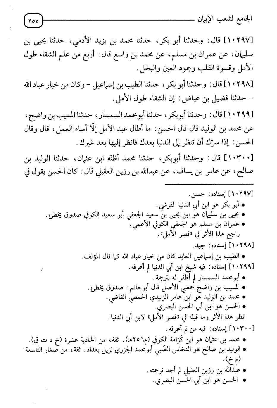 10297 - قَالَ: نَا أَبُو بَكْرٍ، نَا مُحَمَّدُ بْنُ يَزِيدَ الْأَدَمِيُّ، نَا يَحْيَى بْنُ سُلَيْمَانَ، عَنْ عِمْرَانَ بْنِ مُسْلِمٍ، عَنْ مُحَمَّدِ بْنِ وَاسِعٍ قَالَ: " §أَرْبَعٌ مِنْ عِلْمِ الشَّقَاءِ: طُولُ الْأَمَلِ، وَقَسْوَةُ الْقَلْبِ، وَجُمُودُ الْعَيْنِ، وَالْبُخْلُ "