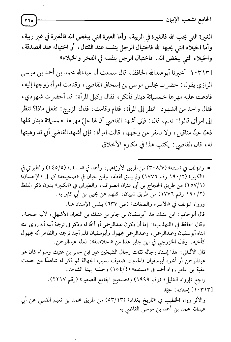 10313 - أَخْبَرَنَا أَبُو عَبْدِ اللهِ الْحَافِظُ قَالَ: سَمِعْتُ أَبَا عَبْدِ اللهِ مُحَمَّدَ بْنَ أَحْمَدَ بْنِ مُوسَى الرَّازِيُّ يَقُولُ: حَضَرْتَ مَجْلِسَ مُوسَى بْنِ إِسْحَاقَ الْقَاضِي وَقَدَّمَتِ امْرَأَةٌ زَوْجَهَا إِلَيْهِ فَادَّعَتْ عَلَيْهِ مَهْرَهَا خَمْسَمِائَةِ دِينَارٍ، فَأَنْكَرَ الرَّجُلُ، فَقَالَ وَكِيلُ الْمَرْأَةِ: قَدْ أَحَضَرْتُ شُهُودِي، فَقَالَ وَاحِدٌ مِنَ الشُّهُودِ: أَنْظُرُ إِلَى الْمَرْأَةِ. فَقَامَ وَقَامَتْ، فَقَالَ الزَّوْجُ: بِفِعْلِ مَاذَا يَنْظُرُ إِلَى امْرَأَتِي، قَالُوا: نَعَمْ. قَالَ: فَإِنِّي §أُشْهِدُ الْقَاضِي أَنَّ لَهَا عَلَيَّ مَهْرَهَا خَمْسَمِائَةَ دِينَارٍ كُلَّهَا ذَهَبًا عَيْنًا مَثَاقِيلَ وَلَا تُسْفِرُ عَنْ وَجْهِهَا، قَالَتِ الْمَرْأَةُ: فَإِنِّي أُشْهِدُ الْقَاضِي أَنِّي قَدْ وَهَبْتُهَا لَهُ. قَالَ الْقَاضِي: يُكْتَبُ هَذَا فِي مَكَارِمِ الْأَخْلَاقِ ". -[266]- قَالَ الْإِمَامُ أَحْمَدُ رَحِمَهُ اللهُ: " قَالَ الْحَلِيمِيُّ: " وَيَدْخُلُ فِي الْغَيْرَةِ الْغَيْرَةُ عَلَى الدِّينِ حَتَّى إِذَا سَمِعَ مُخَالِفًا فِي الدِّينِ يَطْعَنُ فِي دِينِ الْإِسْلَامِ لَمْ يَسْكُنْ وَلَمْ يَغُصَّ، وَمِنْ هَذَا الْبَابِ الْمُحَافَظَةُ عَلَى الْجِهَادِ فِي سَبِيلِ اللهِ عَزَّ وَجَلَّ دَفْعًا لِلْمُشْرِكِينَ عَنْ عَوْرَةِ الْمُسْلِمِينَ، وَإِشْفَاقًا مِنْ أَنْ يَظْهَرُوا عَلَى شَيْءٍ مِنَ الدَّارِ فَيَسْبُوا النِّسَاءَ وَالذَّرَارِيَّ، وَأَوَّلُ مَا يَدْخُلُ فِي هَذِهِ الْجُمْلَةِ الْغَيْرَةُ مِنْ كُلِّ مُسْلِمٍ عَلَى دِينِهِ حَتَّى لَا يُسَلِّمَ بِرُكُوبِ الْمَعَاصِي، وَبَسْطُ الْكَلَامِ فِي كُلِّ فَصْلٍ مِنْ هَذِهِ الْفُصُولِ، وَاللهُ يُوَفِّقُنَا لِطَاعَتِهِ "