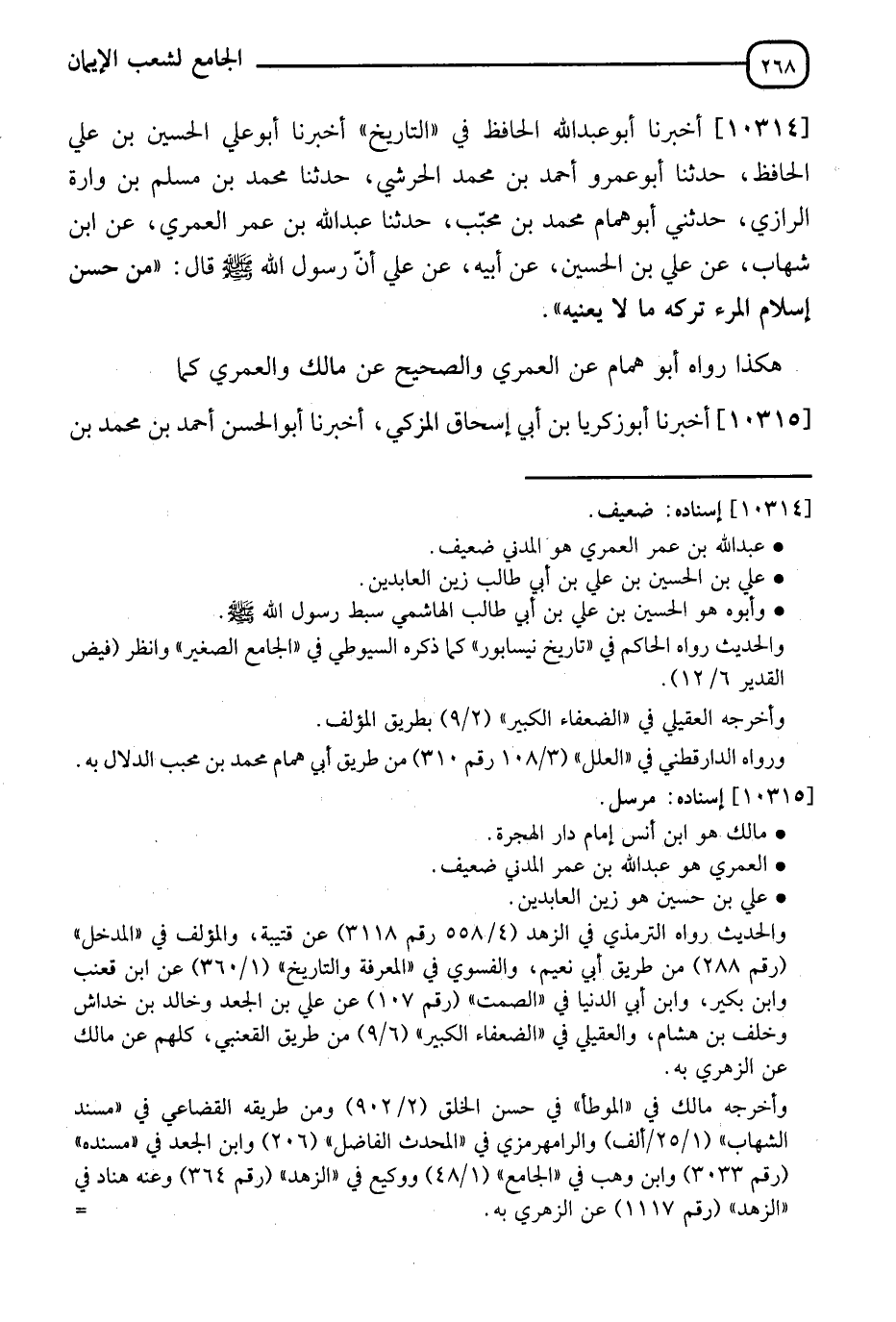 10315 - أَخْبَرَنَا أَبُو زَكَرِيَّا بْنُ أَبِي إِسْحَاقَ الْمُزَكِّي، أَنَا أَبُو الْحَسَنِ أَحْمَدُ بْنُ مُحَمَّدِ بْنِ -[270]- عُبْدُوسَ، نَا عُثْمَانُ بْنُ سَعِيدٍ الدَّارِمِيُّ، نَا الْقَعْنَبِيُّ، أَنَا مَالِكٌ، وَالْعُمَرِيُّ، عَنِ ابْنِ شِهَابٍ، عَنْ عَلِيِّ بْنِ حُسَيْنٍ، أَنَّ رَسُولَ اللهِ صَلَّى اللَّهُ عَلَيْهِ وَسَلَّمَ قَالَ: §" مِنْ حُسْنِ إِسْلَامِ الْمَرْءِ تَرْكُهُ مَا لَا يَعْنِيهِ "