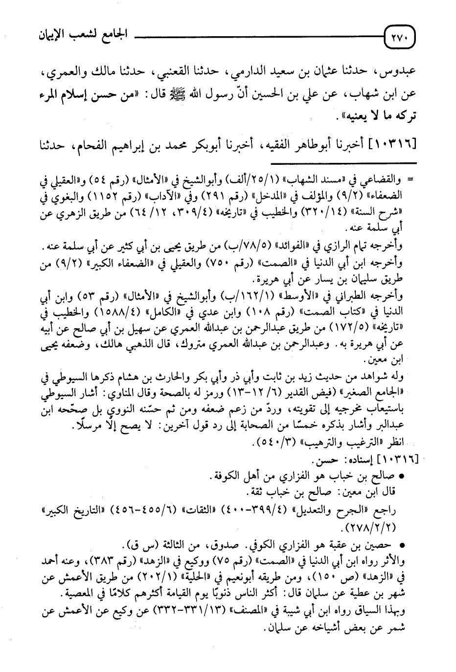 10316 - أَخْبَرَنَا أَبُو طَاهِرٍ الْفَقِيهُ، أَنَا أَبُو بَكْرٍ مُحَمَّدُ بْنُ إِبْرَاهِيمَ الْفَحَّامُ، نَا -[271]- مُحَمَّدُ بْنُ يَحْيَى الذُّهْلِيُّ، نَا أَبُو نُعَيْمٍ الْفَضْلُ بْنُ دُكَيْنٍ الْمُلَائِيُّ، نَا سُفْيَانُ، عَنِ الْأَعْمَشِ، عَنْ صَالِحِ بْنِ خَبَّابٍ، عَنْ حُصَيْنِ بْنِ عُقْبَةَ، عَنْ سَلْمَانَ قَالَ: " إِنَّ §أَكْثَرَ النَّاسِ خَطَايَا يَوْمَ الْقِيَامَةِ أَكْثَرُهُمْ خَوْضًا فِي الْبَاطِلِ ". " كَذَا قَالَ: عَنْ سَلْمَانَ "
