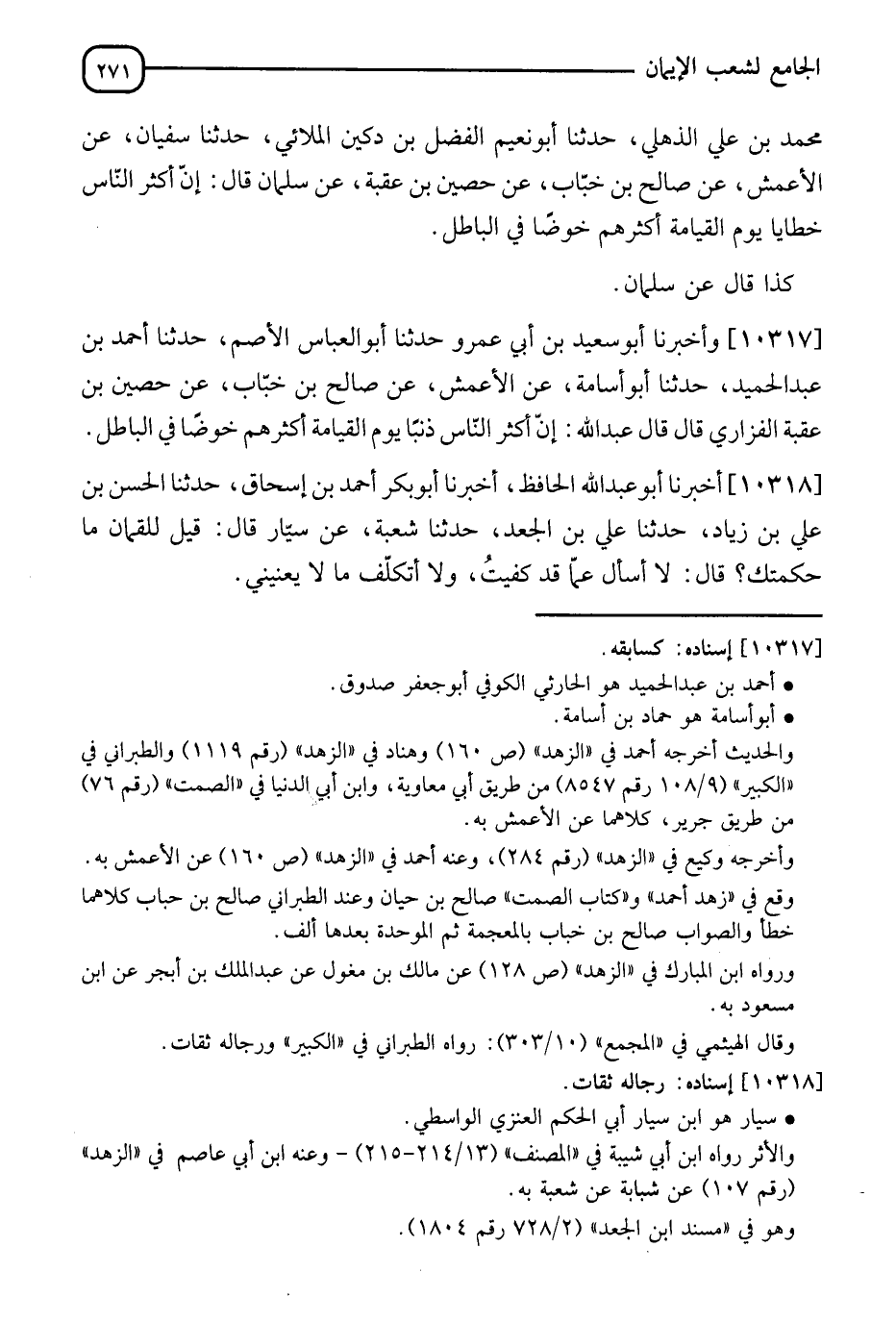 10317 - وَأَخْبَرَنَا أَبُو سَعِيدِ بْنُ أَبِي عَمْرٍو، نَا أَبُو الْعَبَّاسِ الْأَصَمُّ، نَا أَحْمَدُ بْنُ عَبْدِ الْحَمِيدِ، نَا أَبُو أُسَامَةَ، عَنِ الْأَعْمَشِ، عَنْ صَالِحِ بْنِ خَبَّابٍ، عَنْ حُصَيْنِ بْنِ عُقْبَةَ الْفَزَارِيِّ قَالَ: قَالَ عَبْدُ اللهِ: " إِنَّ §أَكْثَرَ النَّاسِ ذَنْبًا يَوْمَ الْقِيَامَةِ أَكْثَرُهُمْ خَوْضًا فِي الْبَاطِلِ "