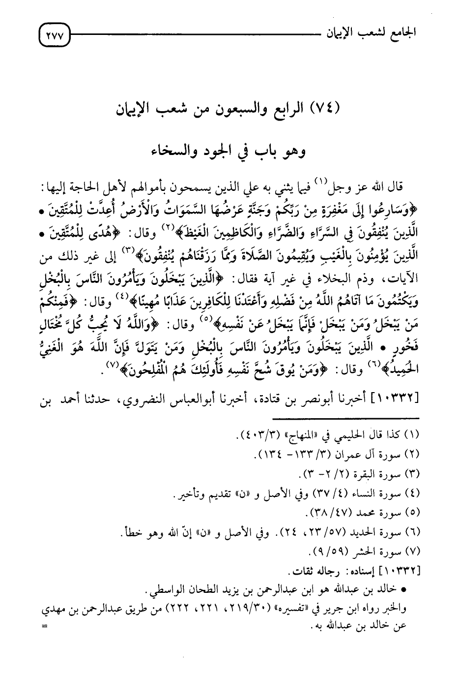 §الرَّابِعُ وَالسَّبْعُونَ مِنْ شُعَبِ الْإِيمَانِ وَهُوَ بَابٌ فِي الْجُودِ وَالسَّخَاءِ " قَالَ اللهُ عَزَّ وَجَلَّ فِيمَا يُثْنِي بِهِ عَلَى الَّذِينَ يَسْمَحُونَ بِأَمْوَالِهِمْ لِأَهْلِ الْحَاجَةِ إِلَيْهَا: {وَسَارِعُوا إِلَى مَغْفِرَةٍ مِنْ رَبِّكُمْ وَجَنَّةٍ عَرْضُهَا السَّمَوَاتُ وَالْأَرْضُ أُعِدَّتْ لِلْمُتَّقِينَ، الَّذِينَ يُنْفِقُونَ فِي السَّرَّاءِ وَالضَّرَّاءِ وَالْكَاظِمِينَ}. وَقَالَ: {هُدًى لِلْمُتَّقِينَ الَّذِينَ يُؤْمِنُونَ بِالْغَيْبِ وَيُقِيمُونَ الصَّلَاةَ وَمِمَّا رَزَقْنَاهُمْ يُنْفِقُونَ} [البقرة: 3] إِلَى غَيْرِ ذَلِكَ مِنَ الْآيَاتِ، وَذَمِّ الْبُخَلَاءِ فِي غَيْرِ آيَةٍ، فَقَالَ: {الَّذِينَ يَبْخَلُونَ وَيَأْمُرُونَ النَّاسَ بِالْبُخْلِ وَيَكْتُمُونَ مَا آتَاهُمُ اللهُ مِنْ فَضْلِهِ، وَأَعْتَدْنَا لِلْكَافِرِينَ عَذَابًا مُهِينًا} [النساء: 37]، وَقَالَ: {فَمِنْكُمْ مَنْ يَبْخَلُ وَمَنْ يَبْخَلْ فَإِنَّمَا يَبْخَلُ عَنْ نَفْسِهِ} [محمد: 38]. وَقَالَ: {وَاللهُ لَا يُحِبُّ كُلَّ مُخْتَالٍ فَخُورٍ، الَّذِينَ يَبْخَلُونَ وَيَأْمُرُونَ النَّاسَ بِالْبُخْلِ وَمَنْ يَتَوَلَّ فَإِنَّ اللهَ هُوَ الْغَنِيُّ الْحَمِيدُ} [الحديد: 23]. وَقَالَ: {وَمَنْ يُوقَ شُحَّ نَفْسِهِ، فَأُولَئِكَ هُمُ الْمُفْلِحُونَ} [الحشر: 9] "