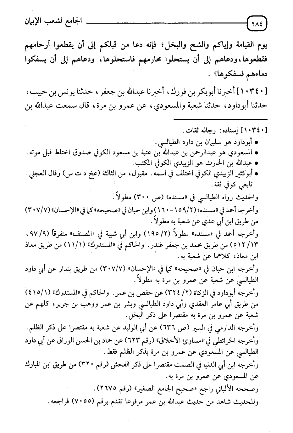 10340 - أَخْبَرَنَا أَبُو بَكْرِ بْنُ فُورَكٍ، أَنَا عَبْدُ اللهِ بْنُ جَعْفَرٍ، نَا يُونُسُ بْنُ حَبِيبٍ، نَا أَبُو دَاوُدَ، نَا شُعْبَةُ، وَالْمَسْعُودِيُّ، عَنْ عَمْرِو بْنِ مُرَّةَ، قَالَ: سَمِعْتُ عَبْدُ اللهِ بْنُ -[285]- الْحَارِثِ يُحَدِّثُ، عَنْ أَبِي كَثِيرٍ الزُّبَيْدِيِّ، عَنْ عَبْدِ اللهِ بْنِ عَمْرِو بْنِ الْعَاصِ قَالَ: قَالَ رَسُولُ اللهِ صَلَّى اللَّهُ عَلَيْهِ وَسَلَّمَ: " §إِيَّاكُمْ وَالظُّلْمَ، فَإِنَّ الظُّلْمَ ظُلُمَاتٌ يَوْمَ الْقِيَامَةِ، وَإِيَّاكُمْ وَالْفُحْشَ، فَإِنَّ اللهَ لَا يُحِبُّ الْفُحْشَ وَلَا التَّفَحُّشَ، وَإِيَّاكُمْ وَالشُّحَّ، فَإِنَّهُ أَهْلَكَ مَنْ كَانَ قَبْلَكُمْ أَمَرَهُمْ بِالْقَطِيعَةِ فَقَطَعُوا، وَأَمَرَهُمْ بِالْبُخْلِ فَبَخِلُوا، وَأَمَرَهُمْ بِالْفُجُورِ فَفَجَرُوا "