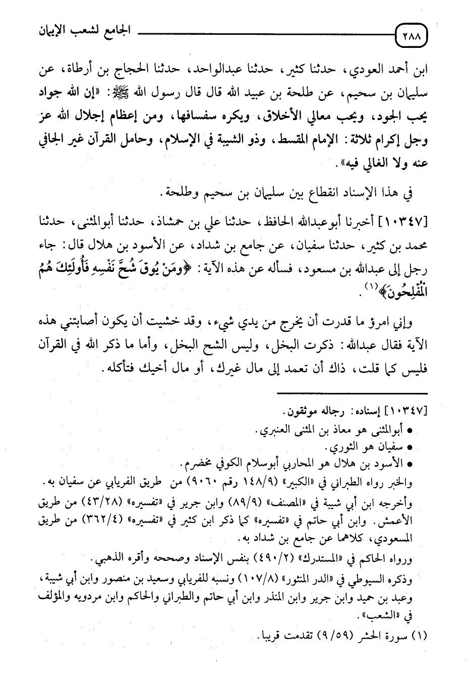 10347 - أَخْبَرَنَا أَبُو عَبْدِ اللهِ الْحَافِظُ، نَا عَلِيُّ بْنُ حَمْشَاذَ، نَا أَبُو الْمُثَنَّى، نَا مُحَمَّدُ بْنُ كَثِيرٍ، نَا سُفْيَانُ، عَنْ جَامِعِ بْنِ شَدَّادٍ، عَنِ الْأَسْوَدِ بْنِ هِلَالٍ قَالَ: جَاءَ رَجُلٌ إِلَى عَبْدِ اللهِ بْنِ مَسْعُودٍ فَسَأَلَهُ عَنْ هَذِهِ الْآيَةِ: {وَمَنْ يُوقَ شُحَّ نَفْسِهِ فَأُولَئِكَ هُمُ الْمُفْلِحُونَ} [الحشر: 9]، وَإِنِّي امْرُؤٌ مَا قَدَرْتُ أَنْ يَخْرُجَ مِنْ يَدِي شَيْءٌ، وَقَدْ خَشِيتُ أَنْ يَكُونَ أَصَابَتْنِي هَذِهِ الْآيَةُ، فَقَالَ عَبْدُ اللهِ: " §ذَكَرْتُ الْبُخْلَ، وَبِئْسَ الشَّيْءُ الْبُخْلُ، وَأَمَّا ذِكْرُ اللهِ فِي الْقُرْآنِ فَلَيْسَ كَمَا قُلْتَ، ذَاكَ أَنْ تَعْمَدَ إِلَى مَالِ غَيْرِكَ أَوْ مَالِ أَخِيكَ فَتَأْكُلَهُ "