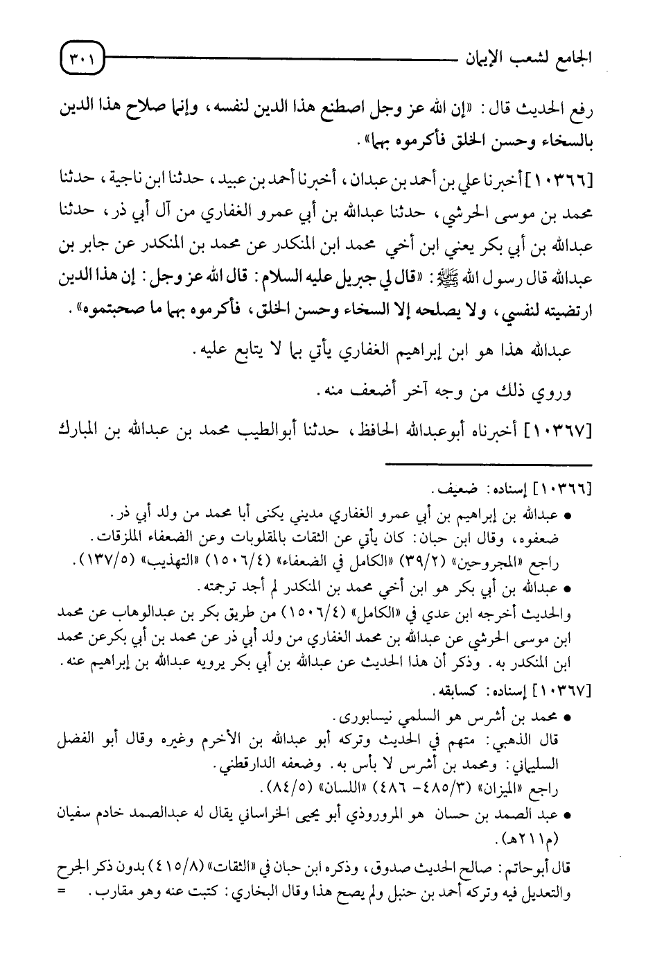 10366 - أَخْبَرَنَا عَلِيُّ بْنُ أَحْمَدَ بْنِ عَبْدَانَ، أَنَا أَحْمَدُ بْنُ عُبَيْدٍ، نَا ابْنُ نَاجِيَةَ، نَا مُحَمَّدُ بْنُ مُوسَى الْحَرَشِيُّ، نَا عَبْدُ اللهِ بْنُ عَمْرِو بْنِ الْعَاصِ الْغِفَارِيُّ مِنْ آلِ أَبِي ذَرٍّ، نَا عَبْدُ اللهِ بْنُ أَبِي بَكْرٍ يَعْنِي ابْنَ أَخِي مُحَمَّدِ بْنِ الْمُنْكَدِرِ، عَنْ مُحَمَّدِ بْنِ الْمُنْكَدِرِ، عَنْ جَابِرِ بْنِ عَبْدِ اللهِ قَالَ رَسُولُ اللهِ صَلَّى اللَّهُ عَلَيْهِ وَسَلَّمَ: " قَالَ لِي جِبْرِيلُ عَلَيْهِ السَّلَامُ: §قَالَ اللهُ عَزَّ وَجَلَّ: إِنَّ هَذَا الدِّينَ ارْتَضَيْتُهُ لِنَفْسِي، وَلَا يُصْلِحُهُ إِلَّا السَّخَاءُ وَحُسْنُ الْخَلْقِ فَأَكْرِمُوهُ بِهِمَا مَا صَحِبْتُمُوهُ ". عَبْدُ اللهِ هَذَا هُوَ إِبْرَاهِيمُ الْغِفَارِيُّ يَأْتِي بِمَا لَا يُتَابَعُ عَلَيْهِ، وَرُوِي ذَلِكَ مِنْ وَجْهٍ آخَرَ أَضْعَفَ مِنْهُ