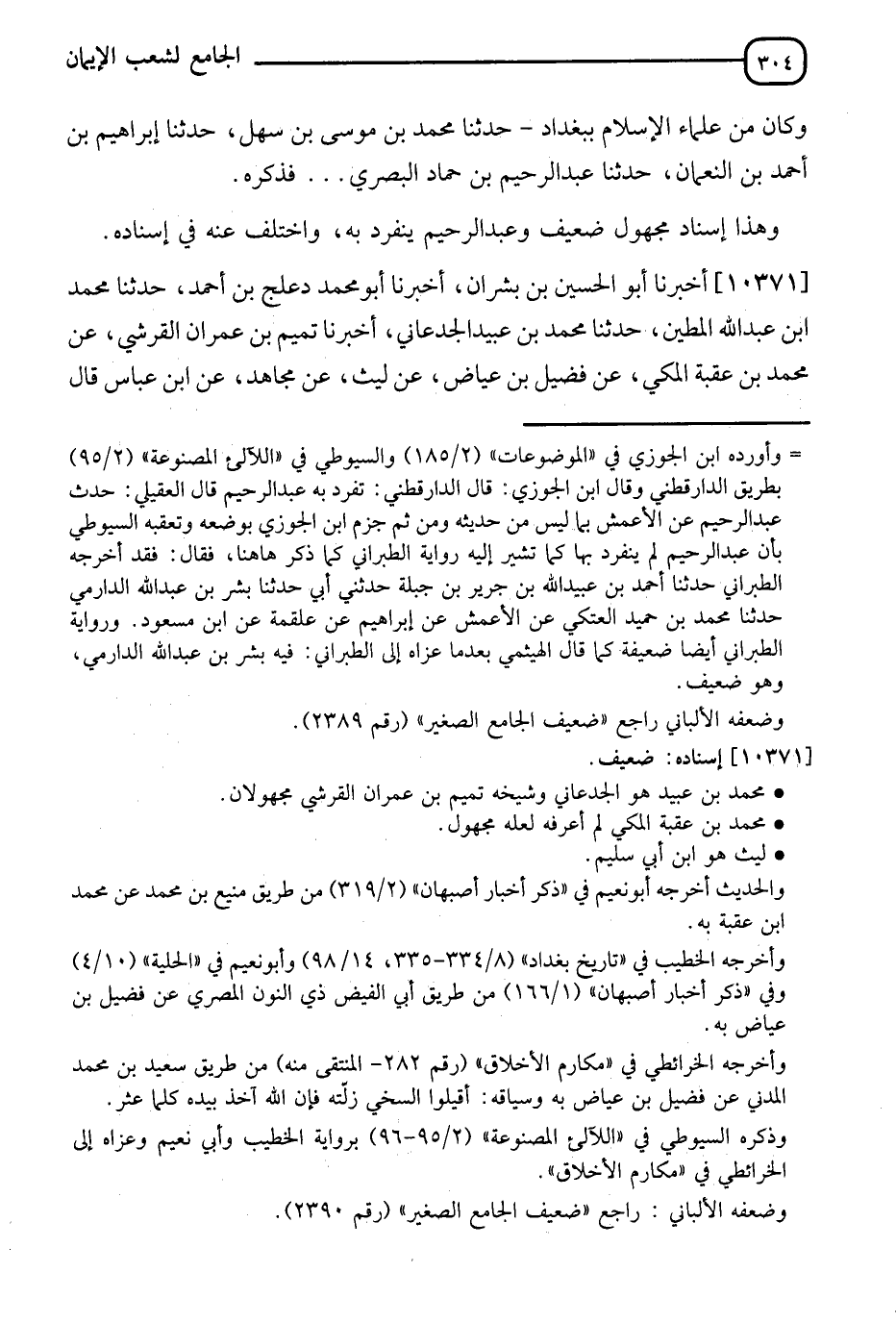 10371 - أَخْبَرَنَا أَبُو الْحُسَيْنِ بْنُ بُشْرَانَ، أَنَا أَبُو مُحَمَّدٍ دَعْلَجُ بْنُ أَحْمَدَ، نَا مُحَمَّدُ بْنُ عَبْدِ اللهِ الْمُطَيَّنُ، نَا مُحَمَّدُ بْنُ عُبَيْدٍ الْجَدْعَانِيُّ، أَنَا تَمِيمُ بْنُ عِمْرَانَ الْقُرَشِيُّ، عَنْ مُحَمَّدِ بْنِ عُقْبَةَ الْمَكِّيُّ، عَنْ فُضَيْلِ بْنِ عِيَاضٍ، عَنْ لَيْثٍ، عَنْ مُجَاهِدٍ، عَنِ ابْنِ عَبَّاسٍ قَالَ: -[305]- قَالَ رَسُولُ اللهِ صَلَّى اللَّهُ عَلَيْهِ وَسَلَّمَ: " §تَجَافُوا عَنْ ذَنْبِ السَّخِيِّ، فَإِنَّ اللهَ عَزَّ وَجَلَّ آخِذٌ بِيَدِهِ كُلَّمَا عَثَرَ ". فِي هَذَا الْإِسْنَادِ مَجَاهِيلُ