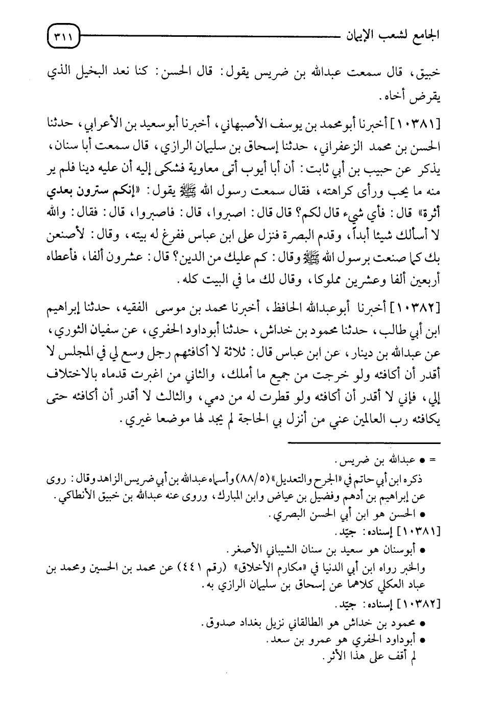 10381 - أَخْبَرَنَا أَبُو مُحَمَّدِ بْنُ يُوسُفَ الْأَصْبَهَانِيُّ، أَنَا أَبُو سَعِيدِ بْنُ الْأَعْرَابِيِّ، نَا الْحَسَنُ بْنُ مُحَمَّدٍ الزَّعْفَرَانِيُّ، نَا إِسْحَاقُ بْنُ سُلَيْمَانَ الرَّازِيُّ قَالَ: سَمِعْتُ أَبَا شَيْبَانَ، يُذْكَرُ عَنْ حَبِيبِ بْنِ أَبِي ثَابِتٍ، أَنَّ أَبَا يُوسُفَ أَتَى مُعَاوِيَةَ فَشَكَا إِلَيْهِ أَنَّ عَلَيْهِ دَيْنًا، فَلَمْ يَرَ مِنْهُ مَا يُحِبُّ وَرَأَى كَرَاهَتَهُ، فَقَالَ: سَمِعْتُ رَسُولَ اللهِ صَلَّى اللَّهُ عَلَيْهِ وَسَلَّمَ يَقُولُ: " §إِنَّكُمْ سَتَرَوْنَ بَعْدِي أَثَرَةً ". قَالَ: فَأَيُّ شَيْءٍ قَالَ لَكُمْ؟، قَالَ: قَالَ: " اصْبِرُوا ". قَالَ: فَاصْبِرُوا. قَالَ: فَقَالَ: وَاللهِ لَا أَسْأَلُكَ شَيْئًا أَبَدًا، وَقَدِمَ الْبَصْرَةَ فَنَزَلَ عَلَى ابْنِ عَبَّاسٍ، فَفَرَّغَ لَهُ بَيْتَهُ، وَقَالَ: لَأَصْنَعَنَّ بِكَ كَمَا صَنَعْتُ بِرَسُولِ اللهِ صَلَّى اللَّهُ عَلَيْهِ وَسَلَّمَ، وَقَالَ: كَمْ عَلَيْكَ مِنَ الدَّيْنِ؟، قَالَ: عِشْرُونَ أَلْفًا. فَأَعْطَاهُ أَرْبَعِينَ أَلْفًا وَعِشْرِينَ مَمْلُوكًا، وَقَالَ: لَكَ مَا فِي الْبَيْتِ كُلُّهُ