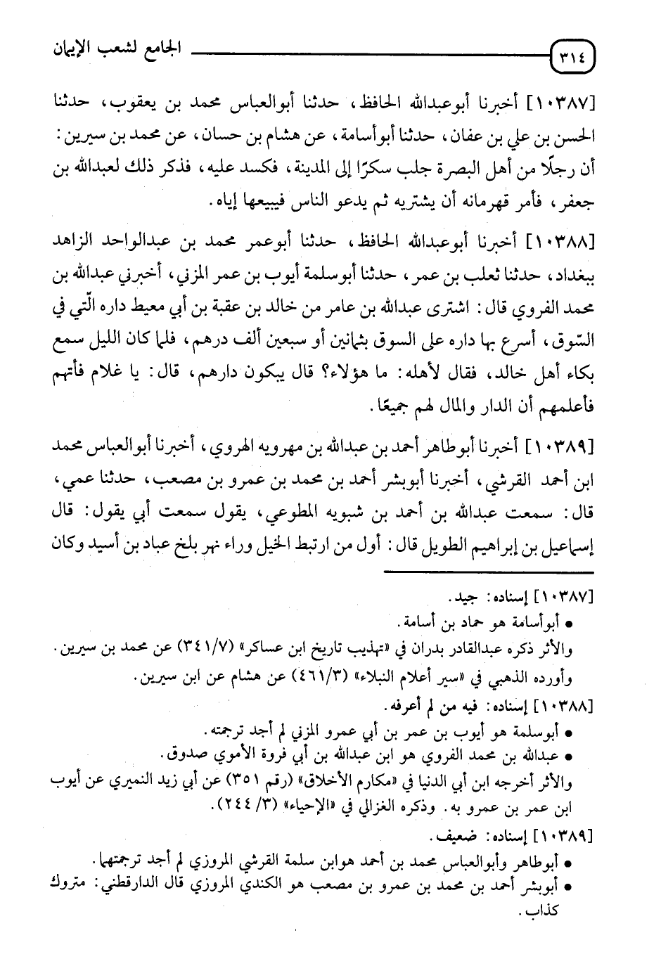 10389 - أَخْبَرَنَا أَبُو طَاهِرٍ أَحْمَدُ بْنُ عَبْدِ اللهِ بْنِ مَهْرَوَيْهِ الْهَرَوِيُّ، أَنَا أَبُو الْعَبَّاسِ مُحَمَّدُ بْنُ أَحْمَدَ الْقُرَشِيُّ، أَنَا أَبُو بِشْرٍ أَحْمَدُ بْنُ مُحَمَّدِ بْنِ عَمْرِو بْنِ مُصْعَبٍ، أَنَا عَمِّي قَالَ: سَمِعْتُ عَبْدَ اللهِ بْنَ أَحْمَدَ بْنِ شَبُّوَيْهِ الْمُطَوِّعِيِّ يَقُولُ: سَمِعْتُ أَبِي يَقُولُ: قَالَ إِسْمَاعِيلُ بْنُ إِبْرَاهِيمَ قَالَ: " أَوَّلُ مَنِ ارْتَبَطَ الْخَيْلَ وَرَاءَ نَهَرِ بَلْخٍ عَبَّادُ بْنُ أُسَيْدٍ، وَكَانَ -[315]- عَبَّادٌ مِمَّنْ كَانَ يُقَالُ مُجَابُ الدَّعْوَةِ، وَكَانَ يَرْتَبِطُ الْخَيْلَ عِدَّةً فِي سَبِيلِ اللهِ وَرَاءَ نَهَرِ بَلْخٍ، وَكَانَ يُنْفِقُ فِي الْخَيْلِ نَفَقَةً عَظِيمَةً ". قَالَ: §" وَبَلَغَ عَبَّادًا أَنَّ رَجُلًا مِنْ جِيرَانِهِ اشْتَرَى بُضَاعَةً فَبَارَتْ وَكَسَدَتْ عَلَيْهِ، فَاغْتَمَّ لِذَلِكَ ". قَالَ: " فَأَتَاهُ عَبَّادٌ وَاشْتَرَى مِنْهُ بِضَاعَتَهُ لِيُفَرِّجَ عَنْ أَخِيهِ، فَلَمَّا اشْتَرَاهَا تَحَرَّكَتْ تِلْكَ الْبِضَاعَةُ حَتَّى طُلِبَتْ مِنْ عَبَّادٍ بِرِبْحِ أُلُوفٍ، فَبَاعَهَا وَدَفَعَ الرِّبْحَ كُلَّهُ إِلَى الَّذِي كَانَ اشْتَرَاهَا مِنْهُ ". وَقَالَ: " إِنَّمَا اشْتَرَيْتُهَا أَوَّلًا لِأُخَلِّصَهُ وَأَسُرُّهُ، فَلَا أُحِبُّ أَنْ أَغُمَّهُ بَعْدُ، فَدَفَعَ الرِّبْحَ كُلَّهُ إِلَيْهِ "