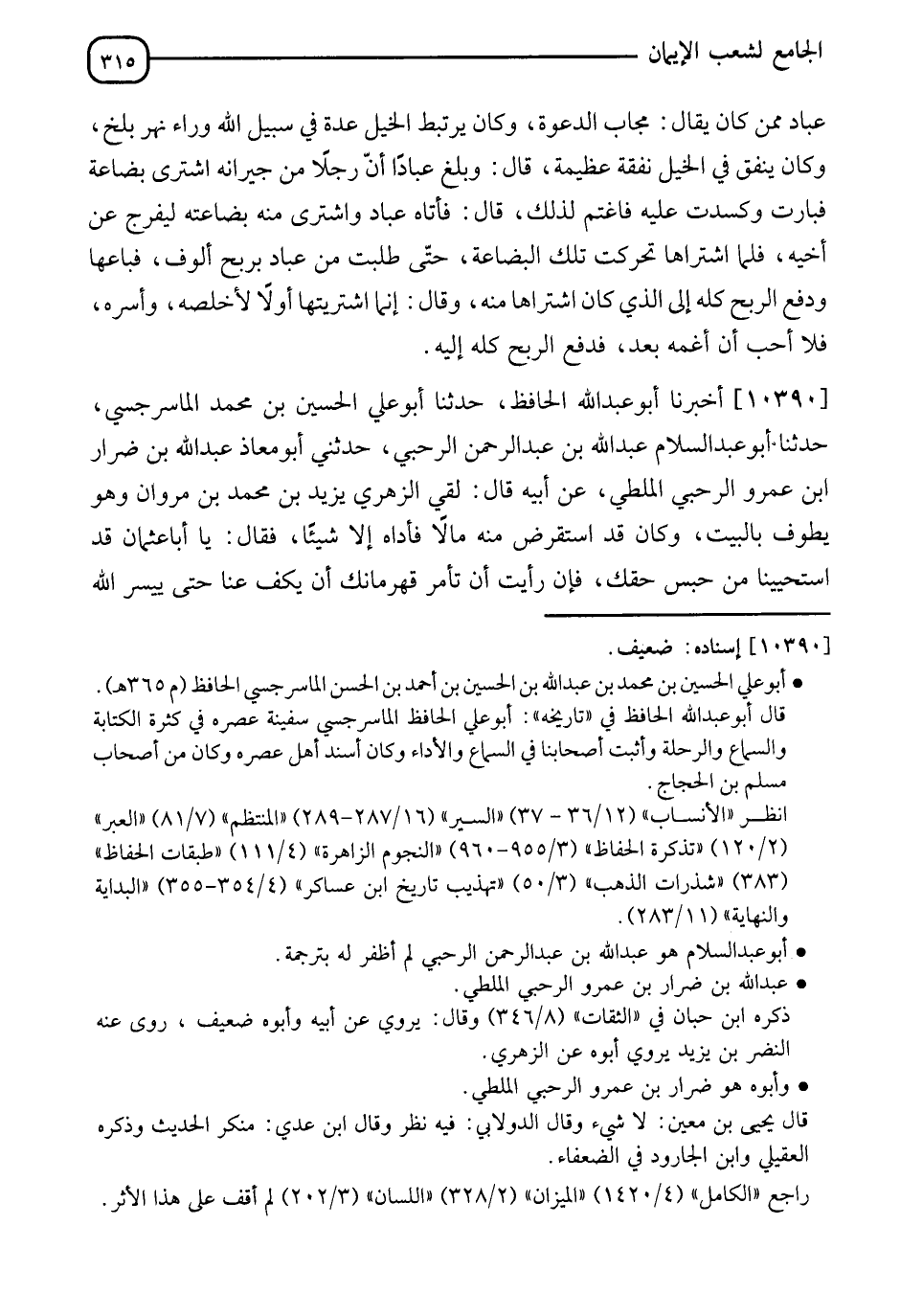 10390 - أَخْبَرَنَا أَبُو عَبْدِ اللهِ الْحَافِظُ، نَا أَبُو الْحُسَيْنِ بْنُ مُحَمَّدٍ الْمَاسَرْجَسِيُّ، نَا أَبُو عَبْدِ السَّلَامِ عَبْدُ اللهِ بْنُ عَبْدِ الرَّحْمَنِ السَّرْجِيُّ، حَدَّثَنِي أَبُو مُعَاذٍ عَبْدُ اللهِ بْنُ ضِرَارِ بْنِ عَمْرٍو الرُّطَبِيُّ الْمَلْطِيُّ، عَنْ أَبِيهِ، قَالَ: لَقِيَ الزُّهْرِيُّ يَزِيدَ بْنَ مُحَمَّدِ بْنِ مَرْوَانَ وَهُوَ يَطُوفُ بِالْبَيْتِ، وَكَانَ قَدِ اسْتَقْرَضَ مِنْهُ مَالًا فَأَدَّاهُ إِلَّا شَيْئًا، فَقَالَ: يَا أَبَا عُثْمَانَ قَدِ اسْتَحْيَيْنَا مِنْ حَبْسِ حَقِّكَ، فَإِنِ رَأَيْتَ أَنْ تَأْمُرَ مَهْرُبَانَكَ أَنْ يَكُفَّ عَنَّا حَتَّى يُيَسِّرَ اللهُ -[316]- عَلَيْنَا. قَالَ: " يَا ابْنَ شِهَابٍ §كَمْ بَقِيَ عَلَيْكَ؟ " قَالَ: خَمْسَ عَشْرَةَ أَلْفٍ. قَالَ: " اذْهَبْ، فَإِنَّهَا لَكَ، وَإِنَّهَا لَقَلِيلٌ فِي الْإِخَاءِ فِي اللهِ عَزَّ وَجَلَّ "