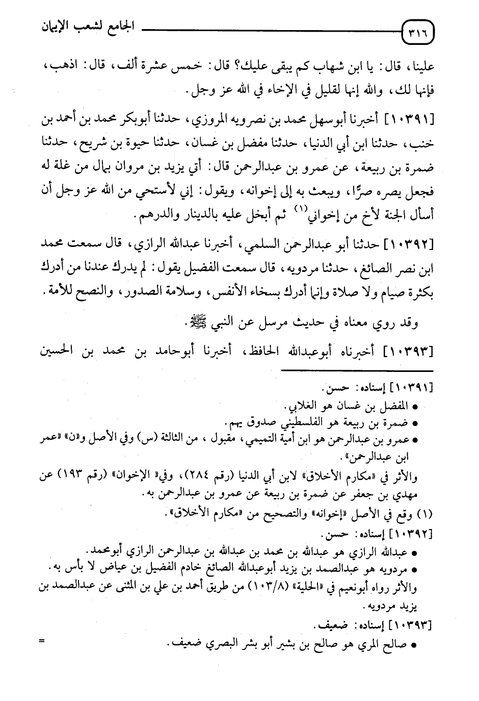 10391 - أَخْبَرَنَا أَبُو سَهْلٍ مُحَمَّدُ بْنُ نَصْرَوَيْهِ الْمَرْوَزِيُّ، نَا أَبُو بَكْرٍ مُحَمَّدُ بْنُ أَحْمَدَ بْنِ خَنْبٍ، نَا ابْنُ أَبِي الدُّنْيَا، نَا مُفَضَّلُ بْنُ غَسَّانَ، نَا حَيْوَةُ بْنُ شُرَيْحٍ، نَا ضَمْرَةُ بْنُ رَبِيعَةَ، عَنْ عُمَرَ بْنِ عَبْدِ الرَّحْمَنِ قَالَ: أَتَى يَزِيدُ بْنُ مَرْوَانَ بِمَالٍ مِنْ غَلَّةٍ لَهُ، فَجَعَلَ يَصُرُّهُ صَرًّا، وَيَبْعَثُ بِهِ إِلَى إِخْوَانِهِ وَيَقُولُ: §" إِنِّي لَأَسْتَحْيِي مِنَ اللهِ عَزَّ وَجَلَّ أَنْ أَسْأَلَ الْجَنَّةَ لِأَخٍ مِنْ إِخْوَانِي، ثُمَّ أَبْخَلُ عَلَيْهِ بِالدِّينَارِ وَالدِّرْهَمِ "