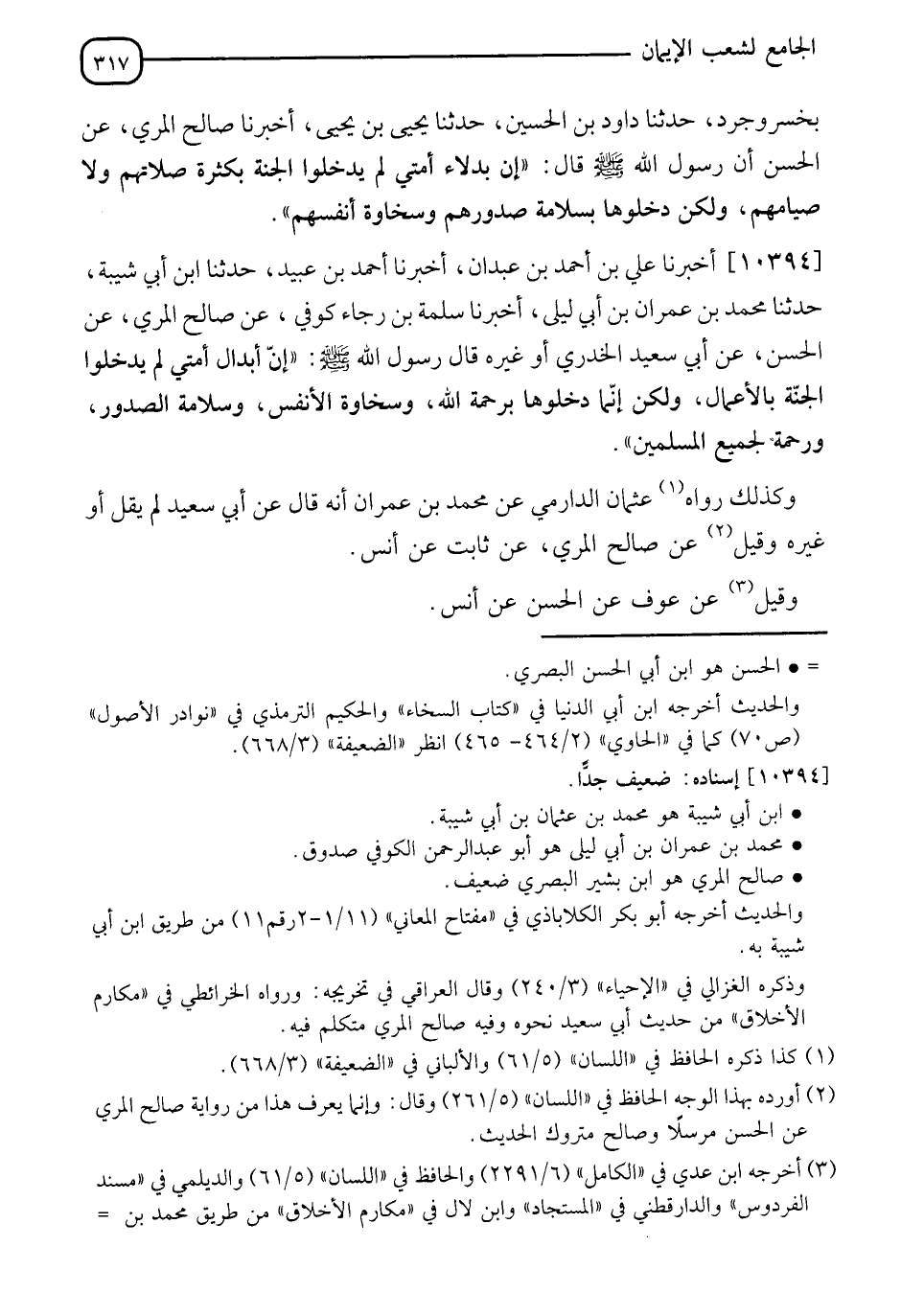 10394 - أَخْبَرَنَا عَلِيُّ بْنُ أَحْمَدَ بْنِ عَبْدَانَ، أَنَا أَحْمَدُ بْنُ عُبَيْدٍ، نَا ابْنُ أَبِي شَيْبَةَ، نَا مُحَمَّدُ بْنُ عِمْرَانَ بْنِ أَبِي لَيْلَى، أَنَا سَلَمَةُ بْنُ رَجَاءٍ كُوفِيٌّ، عَنْ صَالِحٍ الْمُرِّيِّ، عَنِ الْحَسَنِ، عَنْ أَبِي سَعِيدٍ الْخُدْرِيِّ، أَوْ غَيْرُهُ، قَالَ رَسُولُ اللهِ صَلَّى اللَّهُ عَلَيْهِ وَسَلَّمَ: " إِنَّ §أَبْدَالَ أُمَّتِي لَمْ يَدْخُلُوا الْجَنَّةَ بِالْأَعْمَالِ، وَلَكِنْ إِنَّمَا دَخَلُوهَا بِرَحْمَةِ اللهِ، وَسَخَاوَةِ الْأَنْفُسِ، وَسَلَامَةِ الصُّدُورِ، وَرَحْمَةٍ لِجَمِيعِ الْمُسْلِمِينَ " وَكَذَلِكَ رَوَاهُ عُثْمَانُ الدَّارِمِيُّ، عَنْ مُحَمَّدِ بْنِ عِمْرَانَ، أَنَّهُ قَالَ: عَنْ أَبِي سَعِيدٍ، لَمْ يَقُلْ أَوْ غَيْرُهُ. وَقِيلَ: عَنْ صَالِحٍ الْمُرِّيِّ، عَنْ ثَابِتٍ، عَنْ أَنَسٍ. وَقِيلَ: عَنْ عَوْفٍ، عَنِ الْحَسَنِ، عَنْ أَنَسٍ