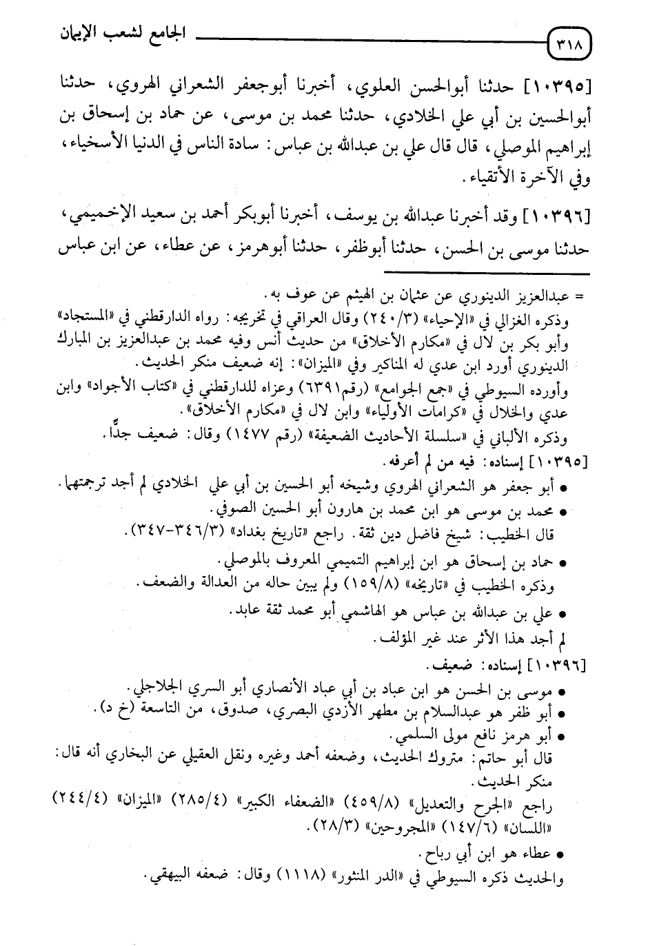10395 - حَدَّثَنَا أَبُو الْحَسَنِ الْعَلَوِيُّ، أَنَا أَبُو جَعْفَرٍ الشَّعْرَانِيُّ بِهَرَوَى، نَا أَبُو الْحُسَيْنِ بْنُ أَبِي عَلِيٍّ الْخَلَّادِيُّ، نَا مُحَمَّدُ بْنُ مُوسَى، عَنْ حَمَّادِ بْنِ إِسْحَاقَ بْنِ إِبْرَاهِيمَ الْمَوْصِلِيِّ قَالَ: قَالَ عَلِيُّ بْنُ عَبْدِ اللهِ بْنِ عَبَّاسٍ: " §سَادَةُ النَّاسِ فِي الدُّنْيَا الْأَسْخِياءُ، وَفِي الْآخِرَةِ الْأَتْقِيَاءَ "