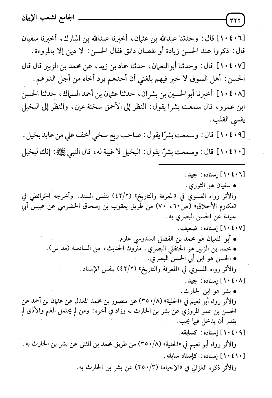 10406 - قَالَ: وَنَا عَبْدُ اللهِ بْنُ عُثْمَانَ، أَنَا عَبْدُ اللهِ بْنُ الْمُبَارَكِ، أَنَا سُفْيَانُ قَالَ: ذَكَرُوا عِنْدَ الْحَسَنِ زِيَادَةَ دَانِقٍ أَوْ نُقْصَانَ دَانِقٍ، فَقَالَ الْحَسَنُ: §" لَا دِينَ إِلَّا بِالْمُرُوءَةِ "
