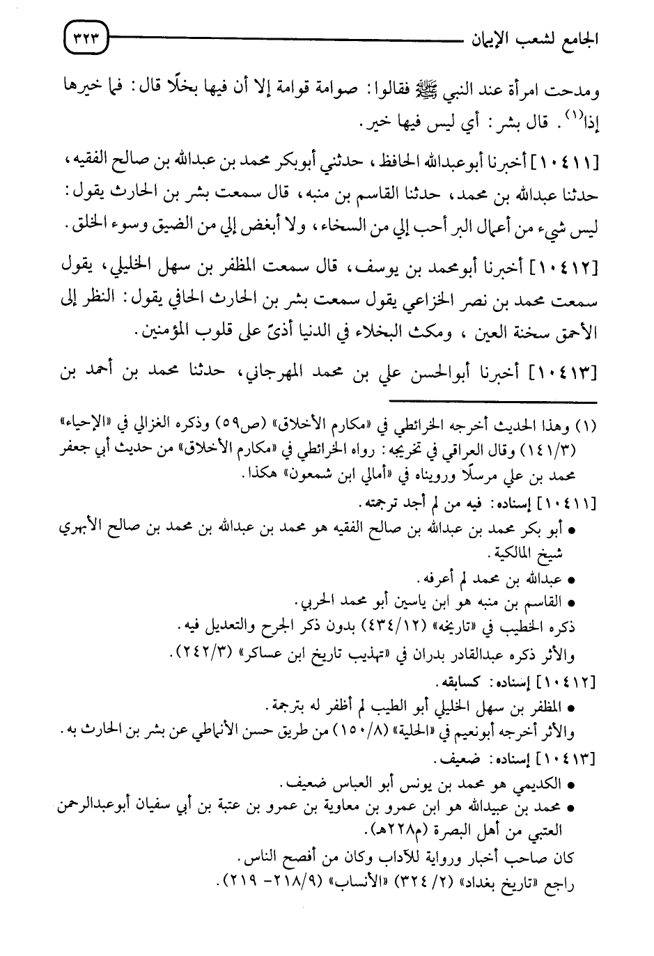 10411 - أَخْبَرَنَا أَبُو عَبْدِ اللهِ الْحَافِظُ، حَدَّثَنِي أَبُو بَكْرٍ مُحَمَّدُ بْنُ عَبْدِ اللهِ بْنِ صَالِحٍ الْفَقِيهُ، نَا عَبْدُ اللهِ بْنُ مُحَمَّدٍ، نَا الْقَاسِمُ بْنُ مُنَبِّهٍ قَالَ: سَمِعْتُ بِشْرَ بْنَ الْحَارِثِ يَقُولُ: " §لَيْسَ شَيْءٌ مِنْ أَعْمَالِ الْبِرِّ أَحَبَّ إِلَيَّ مِنَ السَّخَاءِ، وَلَا أَبْغَضَ إِلَيَّ مِنَ الضِّيقِ وَسُوءِ الْخُلُقِ "