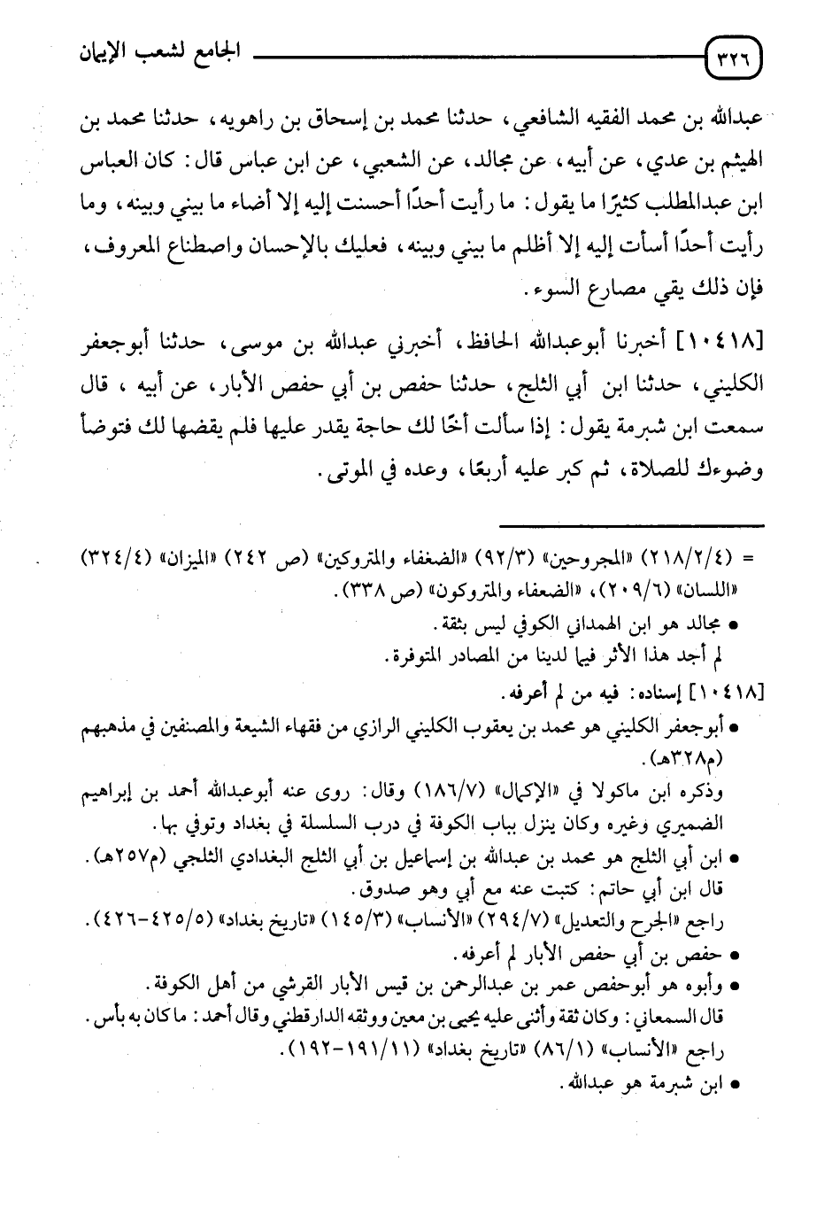 10418 - أَخْبَرَنَا أَبُو عَبْدِ اللهِ الْحَافِظُ، أَخْبَرَنِي عَبْدُ اللهِ بْنُ مُوسَى، أَنَا جَعْفَرٌ الْكُلَيْبِيُّ، نَا ابْنُ أَبِي الثَّلْجِ، نَا حَفْصُ بْنُ أَبِي حَفْصٍ الْأَبَّارُ، عَنْ أَبِيهِ قَالَ: سَمِعْتُ ابْنَ شُبْرُمَةَ يَقُولُ: §" إِذَا سَأَلْتَ أَخًا لَكَ حَاجَةً يَقْدِرُ عَلَيْهَا فَلَمْ يَقْضِهَا لَكَ فَتَوَضَّأْ وُضُوءَكَ لِلصَّلَاةِ، ثُمَّ كَبِّرْ عَلَيْهِ أَرْبَعًا وَعُدَّهُ فِي الْمَوْتَى "