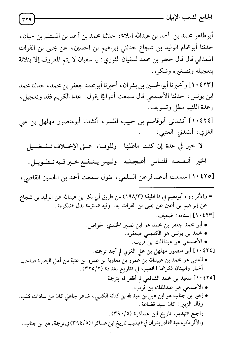 10423 - وَأَخْبَرَنَا أَبُو الْحُسَيْنِ بْنُ بُشْرَانَ، أَنَا أَبُو مُحَمَّدٍ جَعْفَرُ بْنُ مُحَمَّدٍ، نَا مُحَمَّدُ بْنُ يُونُسَ، نَا الْأَصْمَعِيُّ قَالَ: سَمِعْتُ أَعْرَابِيًّا يَقُولُ: " §عِدَّةُ الْكَرِيمِ نَقْدٌ وَتَعْجِيلٌ، وَعِدَّةُ اللَّئِيمِ مَطْلٌ وَتَسْوِيفٌ "