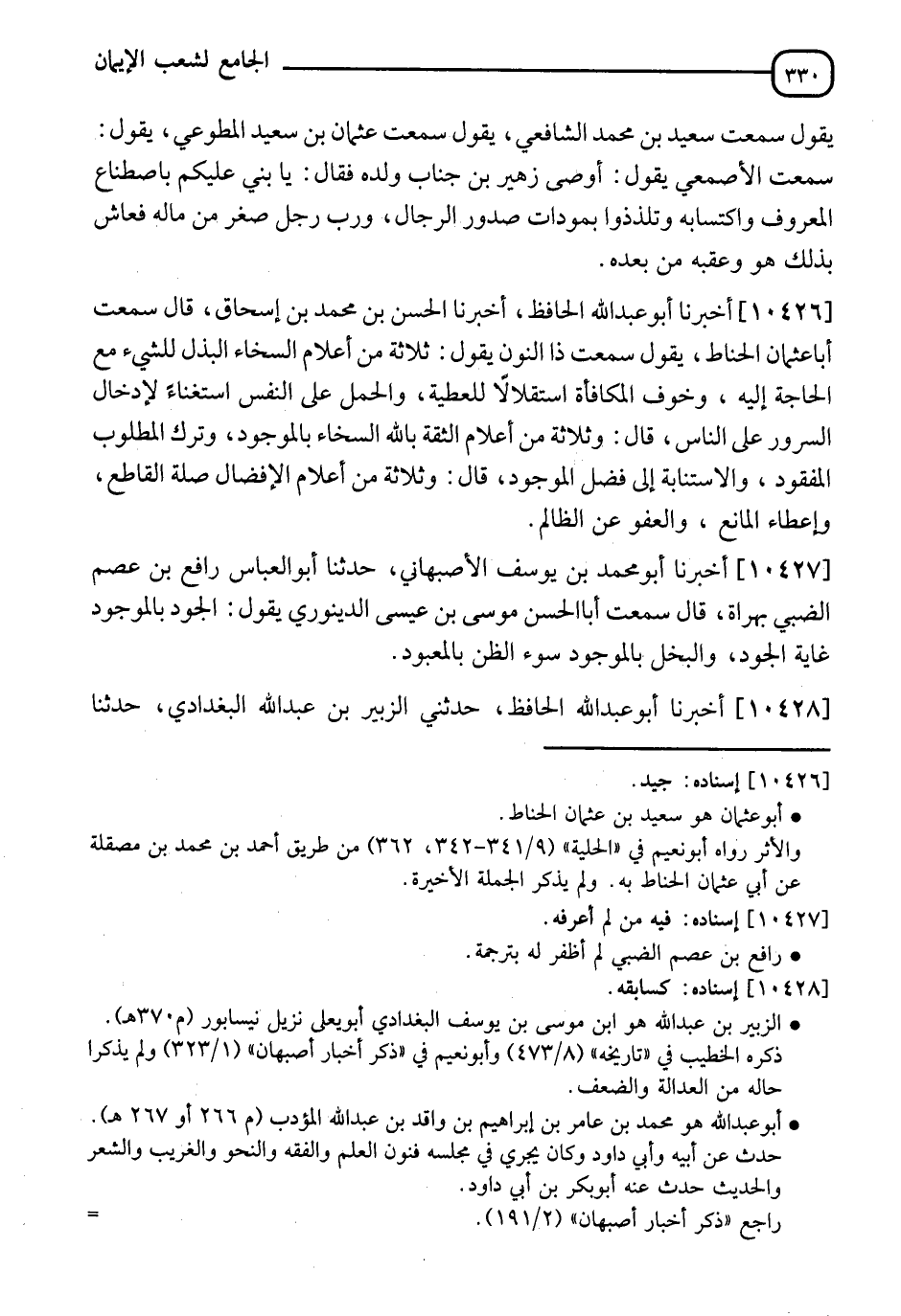 10427 - أَخْبَرَنَا أَبُو مُحَمَّدِ بْنُ يُوسُفَ الْأَصْبَهَانِيُّ، نَا أَبُو الْعَبَّاسِ رَافِعُ بْنُ عُصْمٍ الضَّبِّيُّ بِهَرَاةَ قَالَ: سَمِعْتُ أَبَا الْحَسَنِ مُوسَى بْنَ عِيسَى الدَّيْنُورِيُّ يَقُولُ: " §الْجُودُ بِالْمَوْجُودِ غَايَةُ الْجُودِ، وَالْبُخْلِ بِالْمَوْجُودِ سَوْءُ الظَّنِّ بِالْمَعْبُودِ "