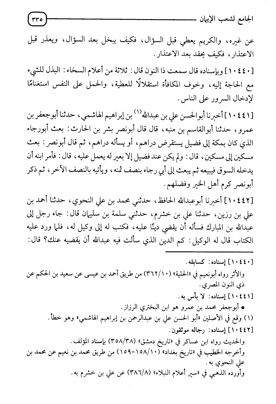 10441 - أَخْبَرَنَا أَبُو الْحَسَنِ عَلِيُّ بْنُ عَبْدِ اللهِ بْنِ إِبْرَاهِيمَ الْهَاشِمِيُّ، نَا أَبُو جَعْفَرٍ مُحَمَّدُ بْنُ عَمْرٍو، نَا الْقَاسِمُ بْنُ مُنَبِّهٍ قَالَ: قَالَ أَبُو نَصْرٍ بِشْرُ بْنُ الْحَارِثِ: §بَعَثَ أَبُو رَجَاءٍ الَّذِي كَانَ بِمَكَّةَ إِلَى فُضَيْلٍ يَسْتَقْرِضُ دَرَاهِمَ أَوْ يَسْأَلُهُ دَنَانِيرَ ". ثُمَّ قَالَ أَبُو نَصْرٍ: " بَعَثَ مِسْكِينٌ إِلَى مِسْكِينٍ ". قَالَ: وَلَمْ يَكُنْ عِنْدَ فُضَيْلٍ إِلَّا بَعِيرٌ لَهُ يَعْمَلُ عَلَيْهِ. قَالَ: فَأَمَرَ ابْنَهُ أَنْ يُدْخِلَهُ السُّوقَ فَيَبِيعَهُ، ثُمَّ يَبْعَثَ إِلَى رَجَاءٍ بِنِصْفِ ثَمَنِهِ، وَيَأْتِيهِ بِالنِّصْفِ الْآخَرِ ". ثُمَّ ذَكَرَ أَبُو نَصْرٍ كَرَمَ أَهْلِ الْخَيْرِ وَفَضْلَهُمْ