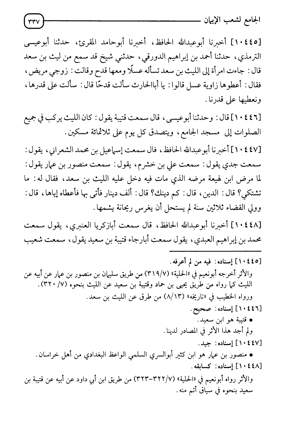 10446 - قَالَ: وَحَدَّثَنَا أَبُو عِيسَى قَالَ: سَمِعْتُ قُتَيْبَةَ يَقُولُ: " كَانَ اللَّيْثُ §يَرْكَبُ فِي جَمِيعِ الصَّلَوَاتِ إِلَى مَسْجِدِ الْجَامِعِ، وَيَتَصَدَّقُ كُلَّ يَوْمٍ عَلَى ثَلَاثِمِائَةِ مِسْكِينٍ "