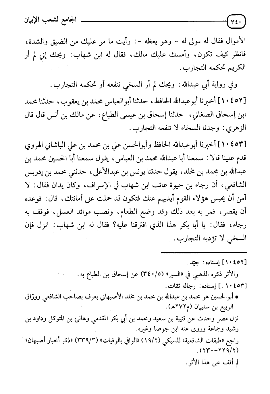 10453 - أَخْبَرَنَا أَبُو عَبْدِ اللهِ الْحَافِظُ، وَأَبُو الْحُسَيْنِ عَلِيُّ بْنُ مُحَمَّدِ بْنِ عَلِيٍّ الْكَاشَانِيُّ الْهَرَوِيُّ قَدِمَ عَلَيْنَا قَالَا: سَمِعْنَا أَبَا عَبْدِ اللهِ مُحَمَّدَ بْنَ الْعَبَّاسِ يَقُولُ: سَمِعْتُ أَبَا الْحُسَيْنِ مُحَمَّدَ بْنَ عَبْدِ اللهِ بْنِ مُحَمَّدِ بْنِ مَخْلَدٍ يَقُولُ: نَا يُونُسُ بْنُ عَبْدِ الْأَعْلَى، حَدَّثَنِي مُحَمَّدُ بْنُ إِدْرِيسَ الشَّافِعِيُّ، أَنَّ رَجَاءَ بْنَ حَيْوَةَ عَاتَبَ ابْنَ شِهَابٍ فِي الْإِسْرَافِ وَكَانَ يُدَانُ، فَقَالَ: لَا آمَنُ أَنْ يَحْبِسَ هَؤُلَاءِ الْقَوْمُ أَيْدِيَهُمْ عَنْكَ فَتَكُونَ قَدْ حُمِلْتَ عَلَى أَمَانِيكَ. قَالَ: فَوَعَدَهُ أَنْ يَقْتَصِرَ، فَمَرَّ بِهِ بَعْدَ ذَلِكَ، وَقَدْ وَضَعَ الطَّعَامَ، وَنَصَبَ مَوَائِدَ الْعَسَلِ، فَوَقَفَ بِهِ رَجَاءٌ فَقَالَ: يَا أَبَا بَكْرٍ هَذَا الَّذِي افْتَرَقْنَا عَلَيْهِ؟، فَقَالَ لَهُ ابْنُ شِهَابٍ: " انْزِلْ، فَإِنَّ §السَّخِيَّ لَا تُؤَدِّبُهُ التَّجَارِبُ "
