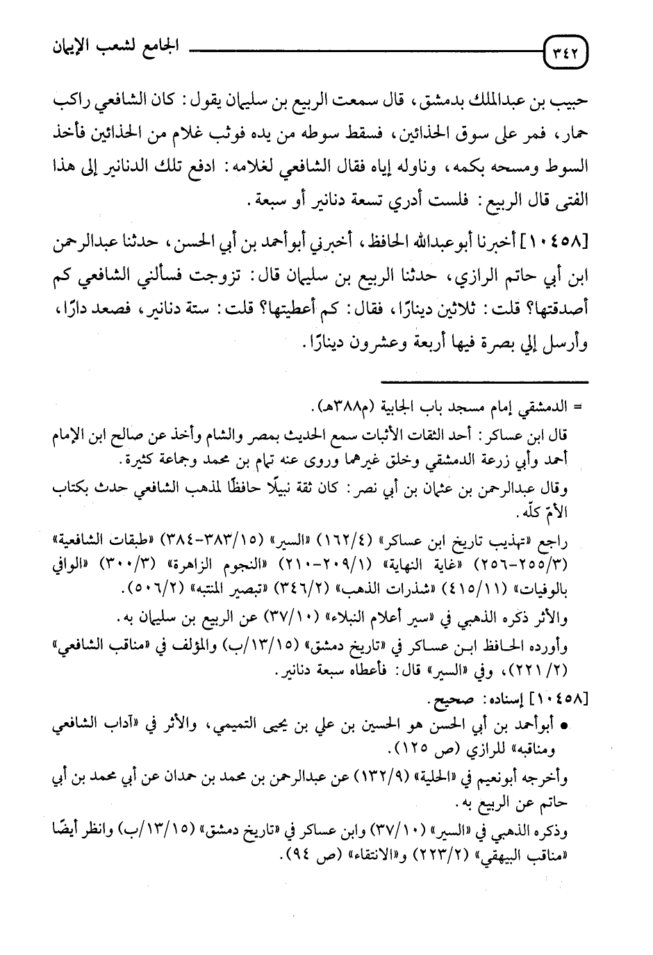 10458 - أَخْبَرَنَا أَبُو عَبْدِ اللهِ الْحَافِظُ، أَخْبَرَنِي أَبُو أَحْمَدَ بْنُ أَبِي الْحَسَنِ، نَا عَبْدُ الرَّحْمَنِ بْنُ أَبِي حَاتِمٍ الرَّازِيُّ، نَا الرَّبِيعُ بْنُ سُلَيْمَانَ قَالَ: تَزَوَّجْتُ فَسَأَلَنِي الشَّافِعِيُّ: " §كَمْ أَصْدَقْتَهَا؟ "، قُلْتُ: ثَلَاثِينَ دِينَارًا. فَقَالَ: " كَمْ أَعْطَيْتَهَا؟ "، قُلْتُ: سِتَّةَ دَنَانِيرَ. فَصَعِدَ دَارًا وَأَرْسَلَ إِلَيَّ بِصُرَّةٍ فِيهَا أَرْبَعَةٌ وَعِشْرُونَ دِينَارًا