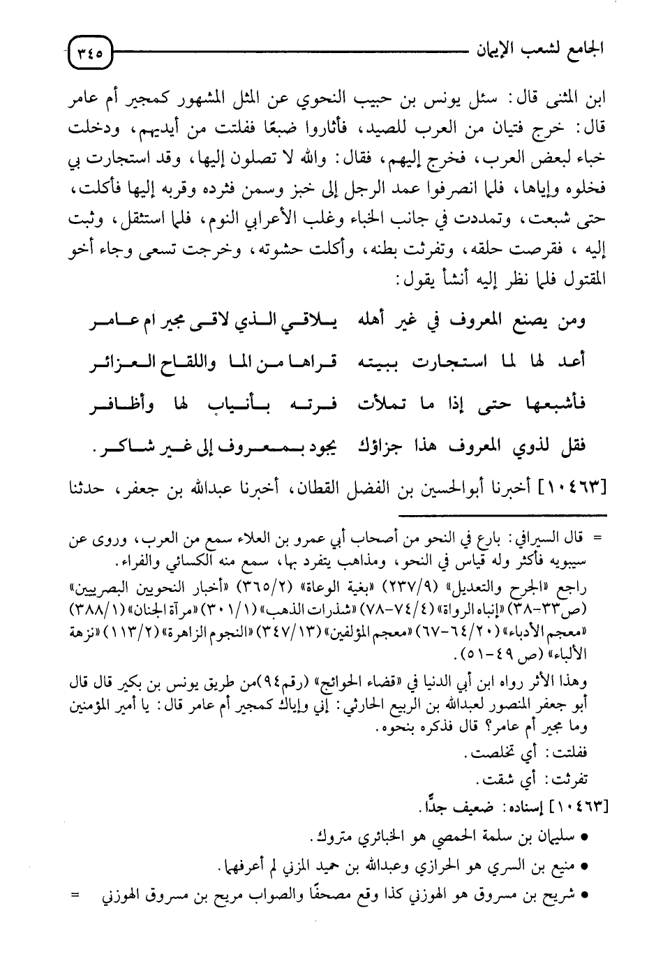 10463 - أَخْبَرَنَا أَبُو الْحُسَيْنِ بْنُ الْفَضْلِ الْقَطَّانُ، أَنَا عَبْدُ اللهِ بْنُ جَعْفَرٍ، نَا -[346]- يَعْقُوبُ بْنُ سُفْيَانَ، حَدَّثَنِي سُلَيْمَانُ بْنُ سَلَمَةَ الْحِمْصِيُّ، نَا مَنِيعُ بْنُ السَّرِيِّ الْحِرَارِيُّ، نَا عَبْدُ اللهِ بْنُ حُمَيْدٍ الْمُزَنِيُّ، عَنْ شُرَيْحِ بْنِ مَسْرُوقٍ أَبِي زَكَرِيَّا، عَنْ أَبِي أُمَامَةَ قَالَ: قَالَ رَسُولُ اللهِ صَلَّى اللَّهُ عَلَيْهِ وَسَلَّمَ: " إِنَّ §الْمَعْرُوفَ لَا يَصْلُحُ إِلَّا لِذِي دِينٍ أَوْ لِذِي حَسَبٍ أَوْ لِذِي حِلْمٍ ". " كَانَ فِي الْكِتَابِ: عَنْ أَبِي زَكَرِيَّا يَنْظُرُ فِيهِ، وَهَذَا إِسْنَادٌ فِيهِ بَعْضُ مَنْ يُجْهَلُ حَالُهُ وَاللهُ أَعْلَمُ، وَقَدْ رُوِيَ مَعْنَاهُ فِي حَدِيثٍ آخَرَ فِي إِسْنَادِهِ ضَعْفٌ بَيِّنٌ "