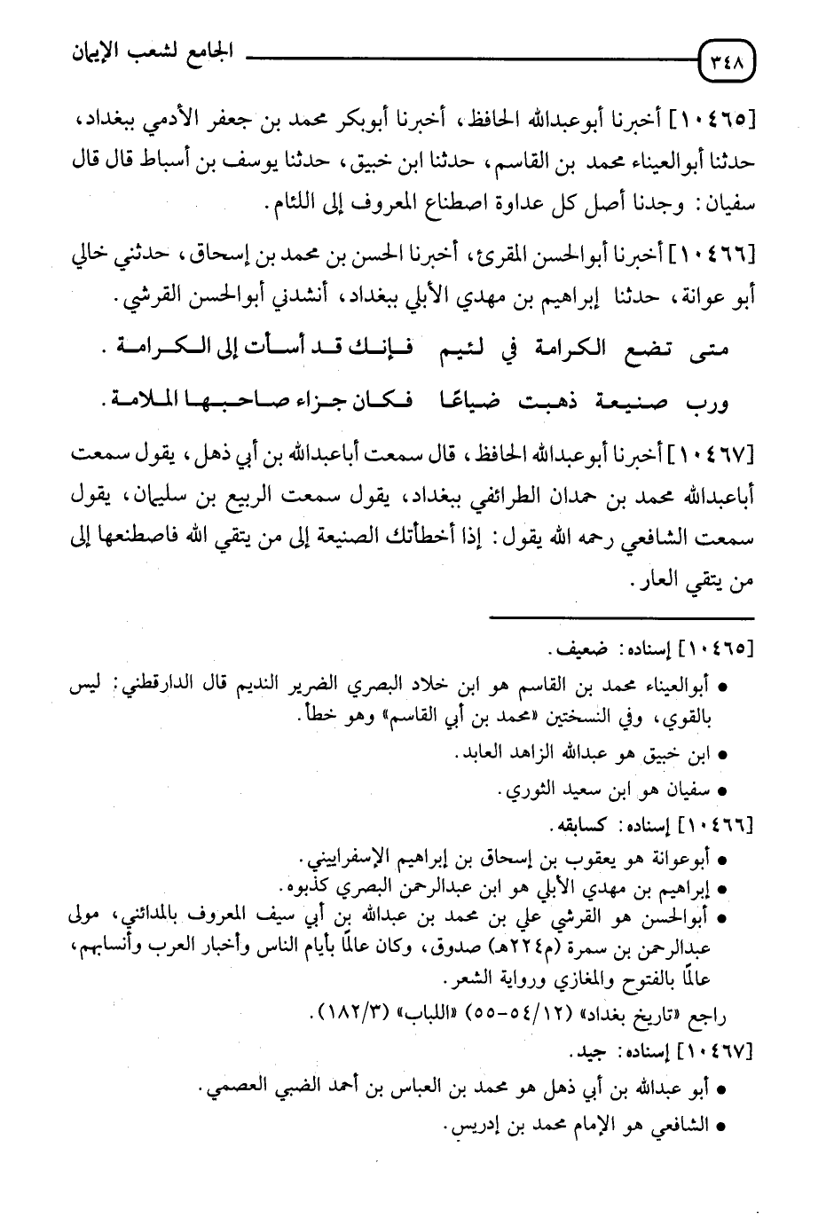 10465 - أَخْبَرَنَا أَبُو عَبْدِ اللهِ الْحَافِظُ، أَنَا أَبُو بَكْرٍ مُحَمَّدُ بْنُ جَعْفَرٍ الْأَدَمِيُّ بِبَغْدَادَ، نَا أَبُو الْعَيْنَاءِ مُحَمَّدُ بْنُ الْقَاسِمِ، نَا ابْنُ خُبَيْقٍ، نَا يُوسُفُ بْنُ أَسْبَاطٍ وَقَالَ: قَالَ سُفْيَانُ: §" وَجَدْنَا أَصْلَ كُلِّ عَدَاوَةٍ اصْطِنَاعَ الْمَعْرُوفِ إِلَى اللِّئَامِ "