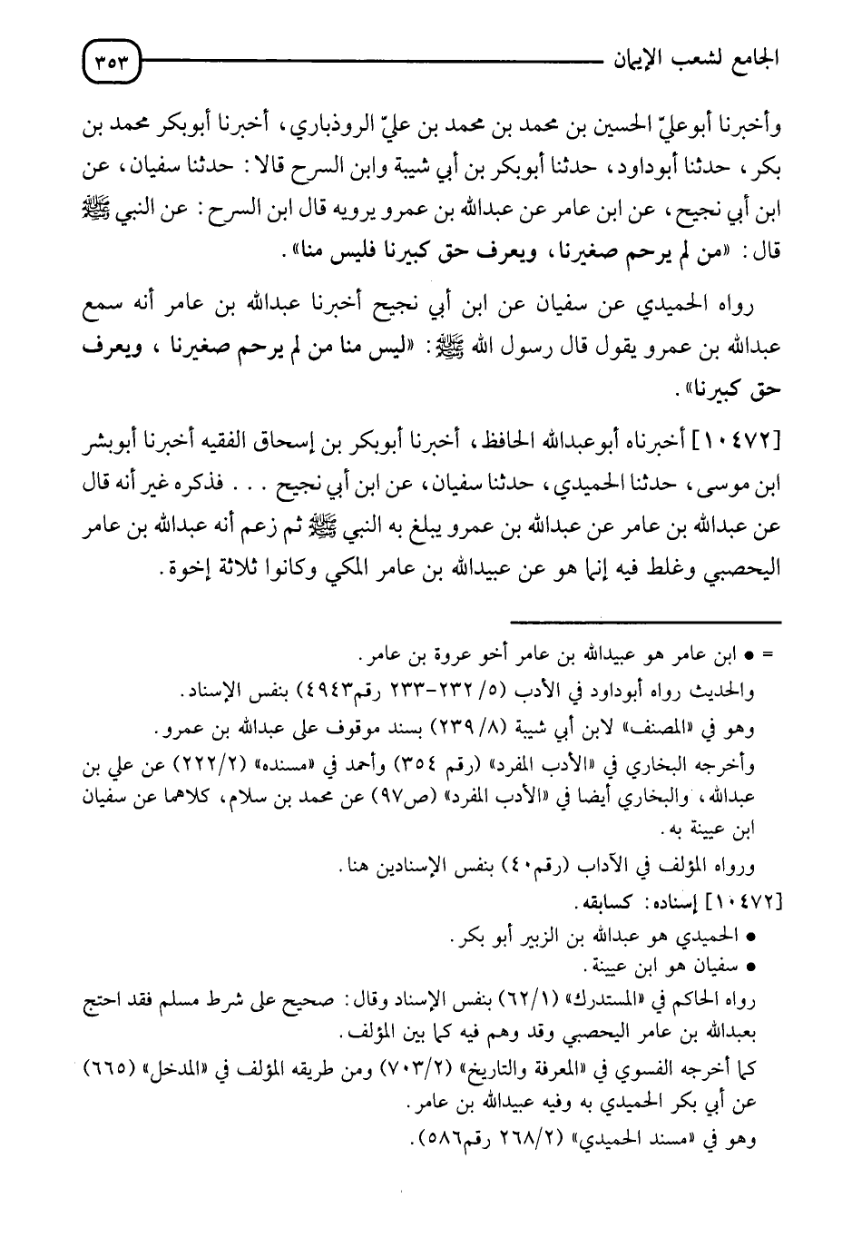 رَوَاهُ الْحُمَيْدِيُّ، عَنْ سُفْيَانَ، عَنِ ابْنِ أَبِي نَجِيحٍ، أَنَا عَبْدُ اللهِ بْنُ عَامِرٍ، أَنَّهُ سَمِعَ عَبْدَ اللهِ بْنَ عَمْرٍو، يَقُولُ: قَالَ رَسُولُ اللهِ صَلَّى اللَّهُ عَلَيْهِ وَسَلَّمَ: §" لَيْسَ مِنَّا مَنْ لَمْ يَرْحَمْ صَغِيرَنَا وَيَعْرِفْ حَقَّ كَبِيرِنَا "