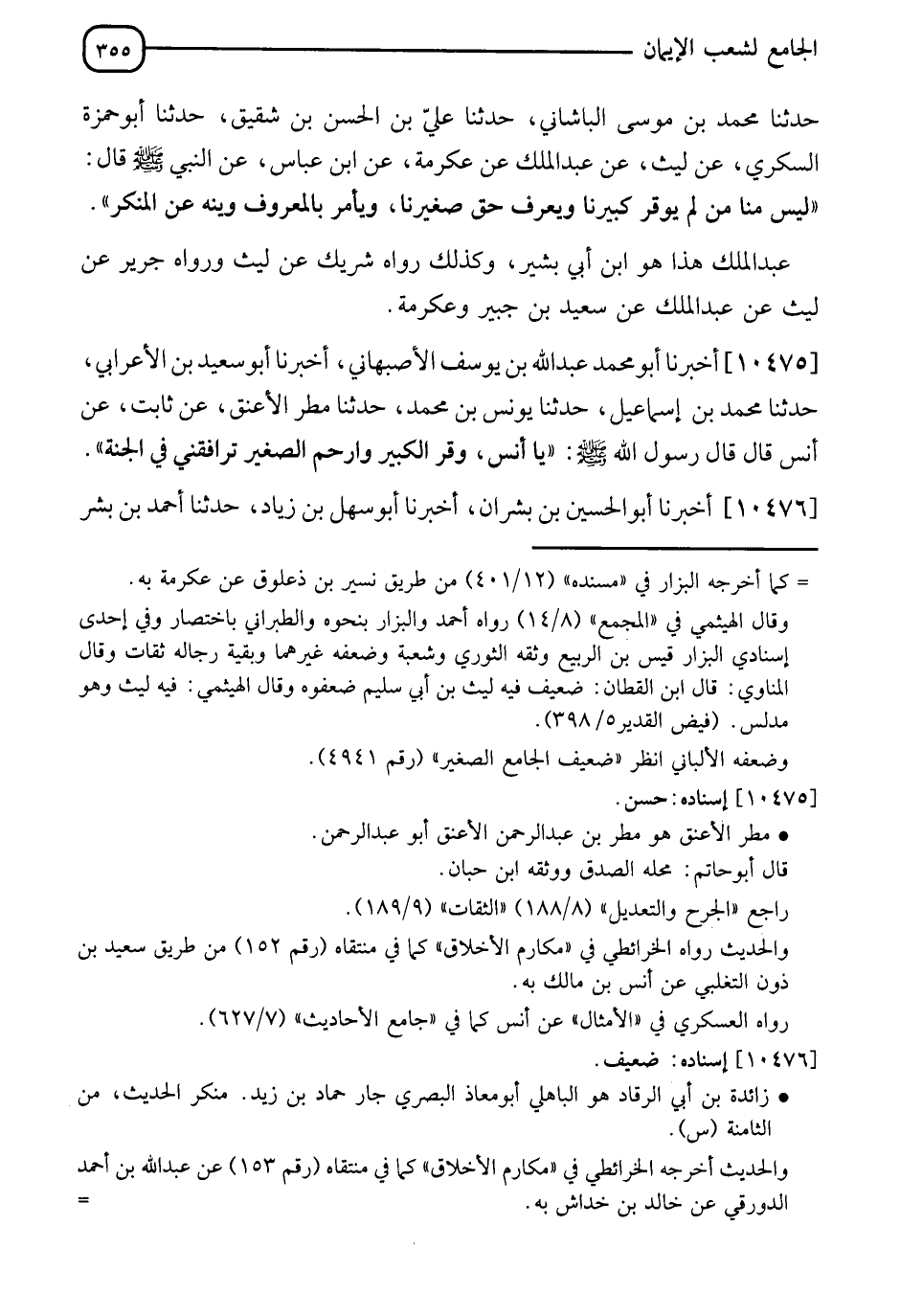 10475 - أَخْبَرَنَا أَبُو مُحَمَّدٍ عَبْدُ اللهِ بْنُ يُوسُفَ الْأَصْبَهَانِيُّ، نَا أَبُو سَعِيدِ بْنُ الْأَعْرَابِيِّ، نَا مُحَمَّدُ بْنُ إِسْمَاعِيلَ، نَا يُونُسُ بْنُ مُحَمَّدٍ، نَا مَطَرٌ الْأَعْنَقُ، عَنْ ثَابِتٍ، عَنْ أَنَسٍ، قَالَ: قَالَ رَسُولُ اللهِ صَلَّى اللَّهُ عَلَيْهِ وَسَلَّمَ: " يَا أَنَسُ، §وَقِّرِ الْكَبِيرَ وَارْحَمِ الصَّغِيرَ تُرَافِقُنِي فِي الْجَنَّةِ "