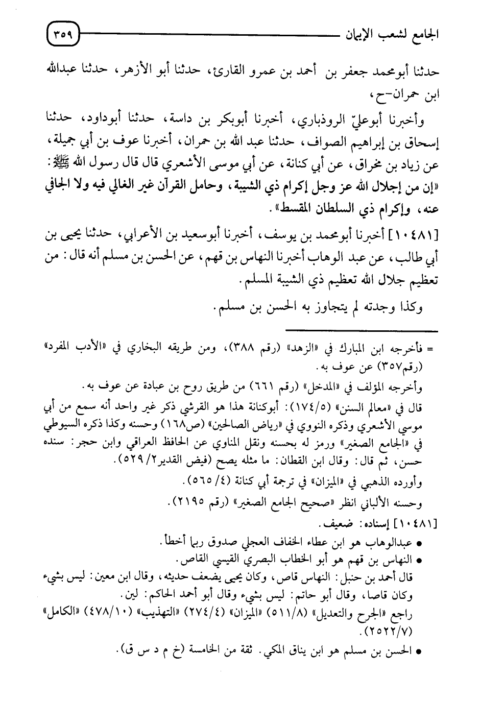 10481 - أَخْبَرَنَا أَبُو مُحَمَّدِ بْنُ يُوسُفَ، أَنَا أَبُو سَعِيدِ بْنُ الْأَعْرَابِيِّ، نَا يَحْيَى بْنُ أَبِي طَالِبٍ، عَنْ عَبْدِ الْوَهَّابِ، أَنَا النَّهَّاشُ بْنُ فَهْمٍ، عَنِ الْحَسَنِ بْنِ مُسْلِمٍ، أَنَّهُ قَالَ: §" مِنْ تَعْظِيمِ جَلَالِ اللهِ تَعْظِيمُ ذِي الشَّيْبَةِ الْمُسْلِمِ " كَذَا وَجَدْتُهُ لَمْ يُجَاوِزْ بِهِ الْحَسَنَ بْنَ مُسْلِمٍ