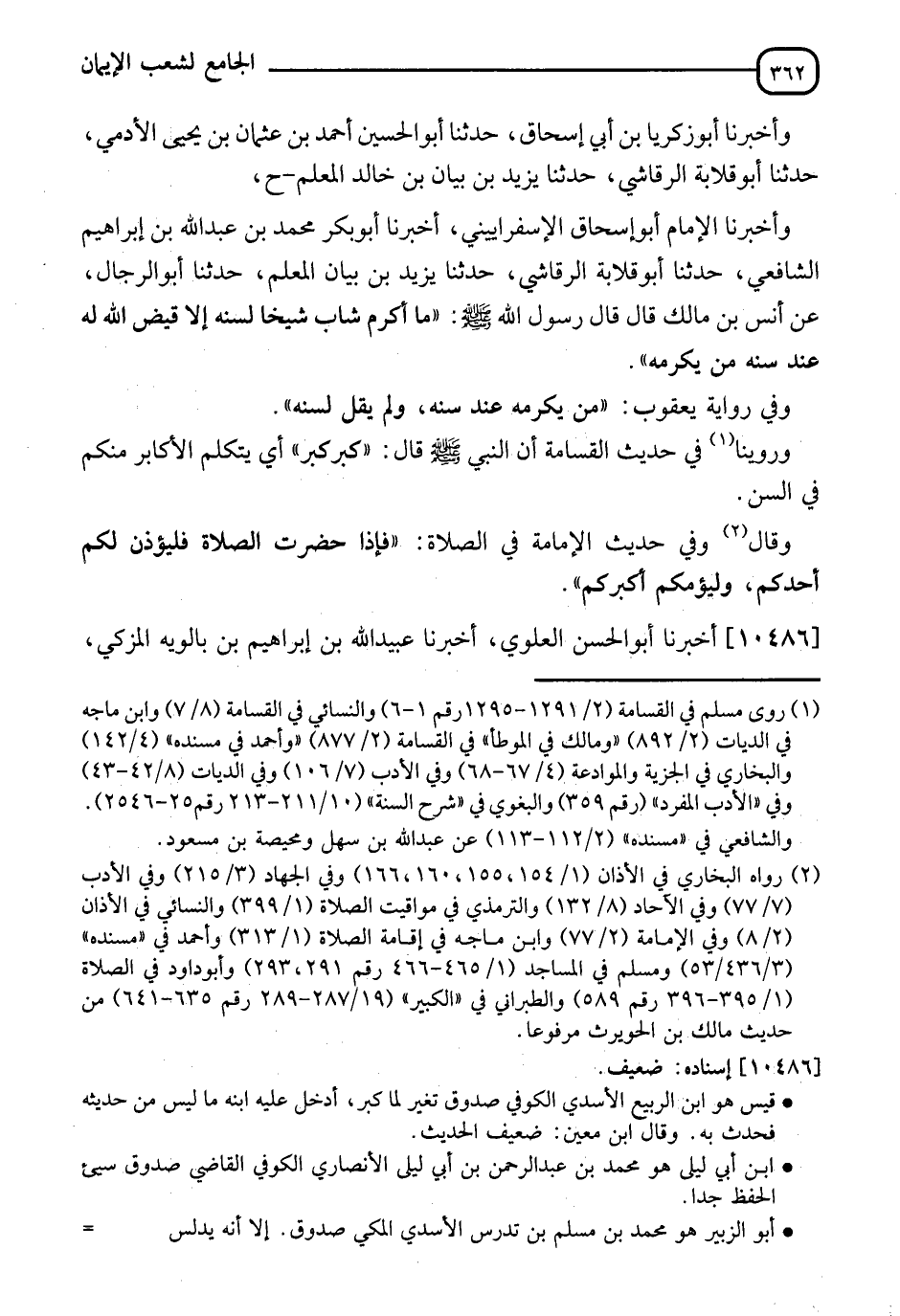 10485 - وَأَخْبَرَنَا الْإِمَامُ أَبُو إِسْحَاقَ الْإِسْفِرَايِينيُّ، أَنَا أَبُو بَكْرٍ مُحَمَّدُ بْنُ عَبْدِ اللهِ بْنِ إِبْرَاهِيمَ الشَّافِعِيُّ، نَا أَبُو قِلَابَةَ الرَّقَاشِيُّ، نَا يَزِيدُ بْنُ بَيَانٍ الْمُعَلِّمُ، نَا أَبُو الرِّجَالِ، عَنْ أَنَسِ بْنِ مَالِكٍ، قَالَ: قَالَ رَسُولُ اللهِ صَلَّى اللَّهُ عَلَيْهِ وَسَلَّمَ: §" مَا أَكْرَمَ شَابٌّ شَيْخًا لِسِنِّهِ إِلَّا قَيَّضَ اللهُ لَهُ عِنْدَ سِنِّهِ مَنْ يُكْرِمُهُ " وَفِي رِوَايَةِ يَعْقُوبَ: " مَنْ يُكْرِمُهُ عِنْدَ سِنِّهِ " وَلَمْ يَقُلْ: لِسِنِّهِ