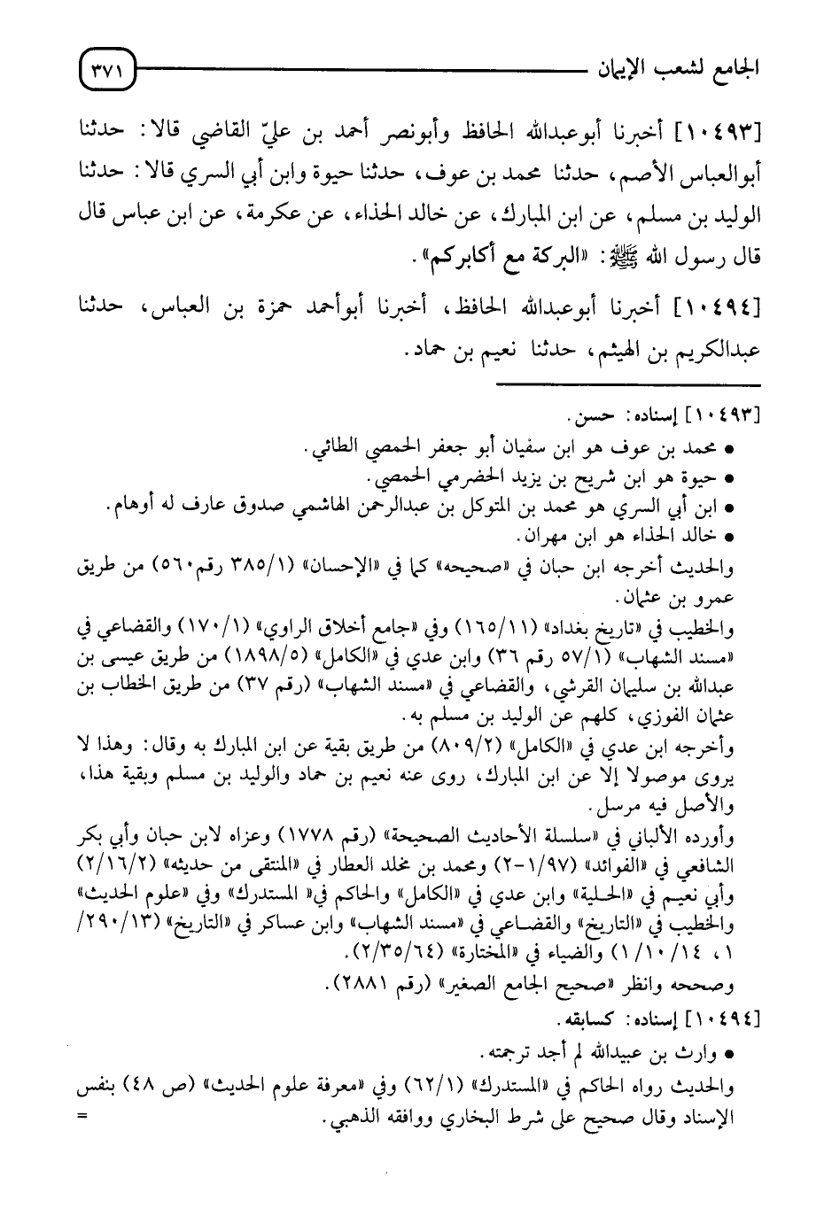 10493 - أَخْبَرَنَا أَبُو عَبْدِ اللهِ الْحَافِظُ، وَأَبُو نَصْرٍ أَحْمَدُ بْنُ عَلِيٍّ الْفَامِيُّ، قَالَا: نَا أَبُو الْعَبَّاسِ الْأَصَمُّ، نَا مُحَمَّدُ بْنُ عَوْفٍ، نَا حَيْوَةُ، وَابْنُ أَبِي السَّرِيِّ، قَالَا: نَا الْوَلِيدُ بْنُ مُسْلِمٍ، عَنِ ابْنِ الْمُبَارَكِ، عَنْ خَالِدٍ الْحَذَّاءِ، عَنْ عِكْرِمَةَ، عَنِ ابْنِ عَبَّاسٍ، قَالَ: قَالَ رَسُولُ اللهِ صَلَّى اللَّهُ عَلَيْهِ وَسَلَّمَ: " §الْبَرَكَةُ مَعَ أَكَابِرِكُمِ "،
