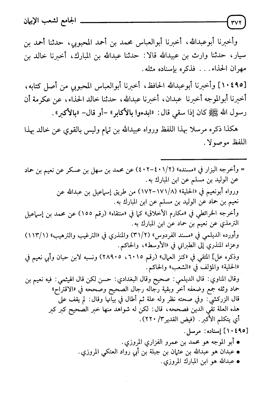 10495 - وَأَخْبَرَنَا أَبُو عَبْدِ اللهِ الْحَافِظُ، أَنَا أَبُو الْعَبَّاسِ الْمَحْبُوبِيُّ، مِنْ أَصْلِ كِتَابِهِ، أَنَا أَبُو الْمُوَجِّهِ، أَنَا عَبْدَانُ، أَنَا عَبْدُ اللهِ، أَنَا خَالِدٍ الْحَذَّاءُ، عَنْ عِكْرِمَةَ: أَنَّ رَسُولَ اللهِ صَلَّى اللَّهُ عَلَيْهِ وَسَلَّمَ كَانَ إِذَا سَقَى، قَالَ: " §ابْدَءُوا بِالْأَكَابِرِ " وَقَالَ: " بِالْأَكْبَرِ " هَكَذَا ذَكَرَهُ مُرْسَلًا بِهَذَا اللَّفْظِ، وَرَوَاهُ عُبَيْدُ اللهِ بْنُ تَمَّامٍ وَلَيْسَ بِالْقَوِيِّ، عَنْ خَالِدٍ بِهَذَا اللَّفْظِ مَوْصُولًا، -[373]-