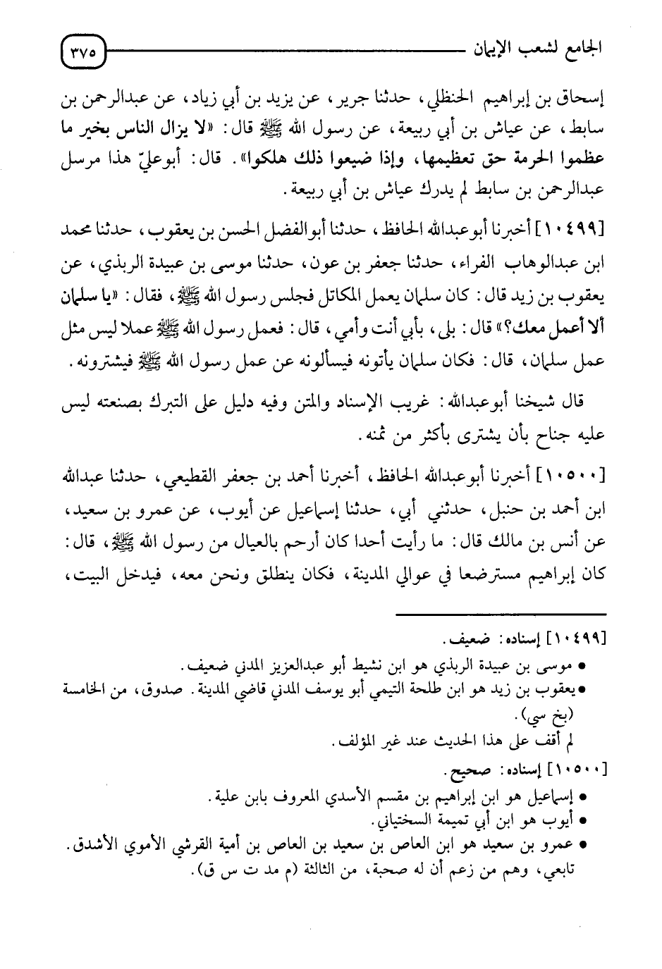 10499 - أَخْبَرَنَا أَبُو عَبْدِ اللهِ الْحَافِظُ، نَا أَبُو الْفَضْلِ الْحَسَنُ بْنُ يَعْقُوبَ، نَا مُحَمَّدُ بْنُ عَبْدِ الْوَهَّابِ الْفَرَّاءُ، نَا جَعْفَرُ بْنُ عَوْنٍ، نَا مُوسَى بْنُ عُبَيْدَةَ الزَّيْدِيُّ، عَنْ يَعْقُوبَ بْنِ زَيْدٍ، قَالَ: كَانَ سَلْمَانُ يَعْمَلُ الْمَكَاتِلَ، فَجَلَسَ رَسُولُ اللهِ صَلَّى اللَّهُ عَلَيْهِ وَسَلَّمَ، فَقَالَ: " يَا سَلْمَانُ §أَلَا أَعْمَلُ مَعَكَ؟ " قَالَ: بَلَى، بِأَبِي أَنْتَ وَأُمِّي. قَالَ: فَعَمِلَ رَسُولُ اللهِ صَلَّى اللَّهُ عَلَيْهِ وَسَلَّمَ عَمَلًا لَيْسَ مِثْلَ عَمَلِ سَلْمَانَ، قَالَ: فَكَانَ سَلْمَانُ يَأْتُونَهُ، فَيَسْأَلُونَهُ عَنْ عَمَلِ رَسُولِ اللهِ صَلَّى اللَّهُ عَلَيْهِ وَسَلَّمَ فَيَشْتَرُونَهُ قَالَ شَيْخُنَا أَبُو عَبْدِ اللهِ: غَرِيبُ الْإِسْنَادِ وَالْمَتْنِ، وَفِيهِ دَلِيلٌ عَلَى أَنَّ الْمُتَبَرِّكَ بِصَنْعَتِهِ لَيْسَ عَلَيْهِ جُنَاحٌ أَنْ يَشْتَرِيَ بِأَكْثَرَ مِنْ ثَمَنِهِ