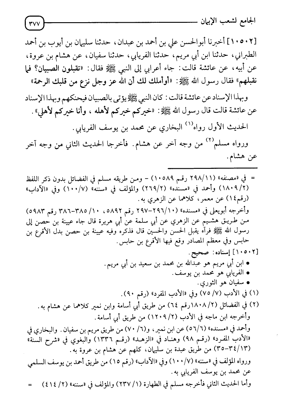 10502 - أَخْبَرَنَا أَبُو الْحَسَنِ عَلِيُّ بْنُ أَحْمَدَ بْنِ عَبْدَانَ، أَنَا سُلَيْمَانُ بْنُ أَحْمَدَ بْنِ أَيُّوبَ الطَّبَرَانِيُّ، نَا ابْنُ أَبِي مَرْيَمَ، نَا الْفِرْيَابِيُّ، نَا سُفْيَانُ، عَنْ هِشَامِ بْنِ عُرْوَةَ، عَنْ أَبِيهِ، عَنْ عَائِشَةَ، قَالَتْ: جَاءَ أَعْرَابِيٌّ إِلَى النَّبِيِّ صَلَّى اللَّهُ عَلَيْهِ وَسَلَّمَ، فَقَالَ: تُقَبِّلُونَ الصِّبْيَانَ؟ فَمَا نُقَبِّلُهُمْ. فَقَالَ النَّبِيُّ صَلَّى اللَّهُ عَلَيْهِ وَسَلَّمَ: §" أَوَ أَمْلِكُ لَكَ أَنَّ اللهَ عَزَّ وَجَلَّ نَزَعَ مِنْ قَلْبِكَ الرَّحْمَةَ "
