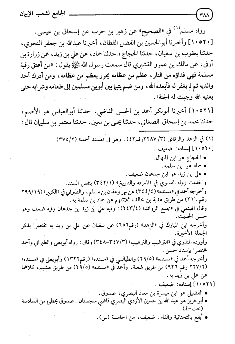 10520 - وَأَخْبَرَنَا أَبُو الْحُسَيْنِ بْنُ الْفَضْلِ الْقَطَّانُ، أَنَا عَبْدُ اللهِ بْنُ جَعْفَرٍ النَّحْوِيُّ، ثَنَا يَعْقُوبُ بْنُ سُفْيَانَ، ثَنَا الْحَجَّاجُ، ثَنَا حَمَّادٌ، عَنْ عَلِيِّ بْنِ زَيْدٍ، عَنْ زُرَارَةَ بْنِ أَوْفَى، عَنْ مَالِكِ بْنِ عَمْرٍو الْقُشَيْرِيِّ، قَالَ: سَمِعْتُ رَسُولَ اللهِ صَلَّى اللَّهُ عَلَيْهِ وَسَلَّمَ، يَقُولُ: §" مَنْ أَعْتَقَ رَقَبَةً مُسْلِمَةً فَهِيَ فِدَاؤُهُ مِنَ النَّارِ عَظْمٌ مِنْ عِظَامِهِ مُحَرَّرٌ بِعَظْمٍ مِنْ عِظَامِهِ، وَمَنَ أَدْرَكَ أَحَدَ وَالِدَيْهِ، ثُمَّ لَمْ يَغْفِرْ لَهُ فَأَبْعَدَهُ اللهُ، وَمَنْ ضَمَّ يَتِيمًا بَيْنَ أَبَوَيْنِ مُسْلِمَيْنِ إِلَى طَعَامِهِ وَشَرَابِهِ حَتَّى يُغْنِيَهُ اللهُ وَجَبَتْ لَهُ الْجَنَّةُ "