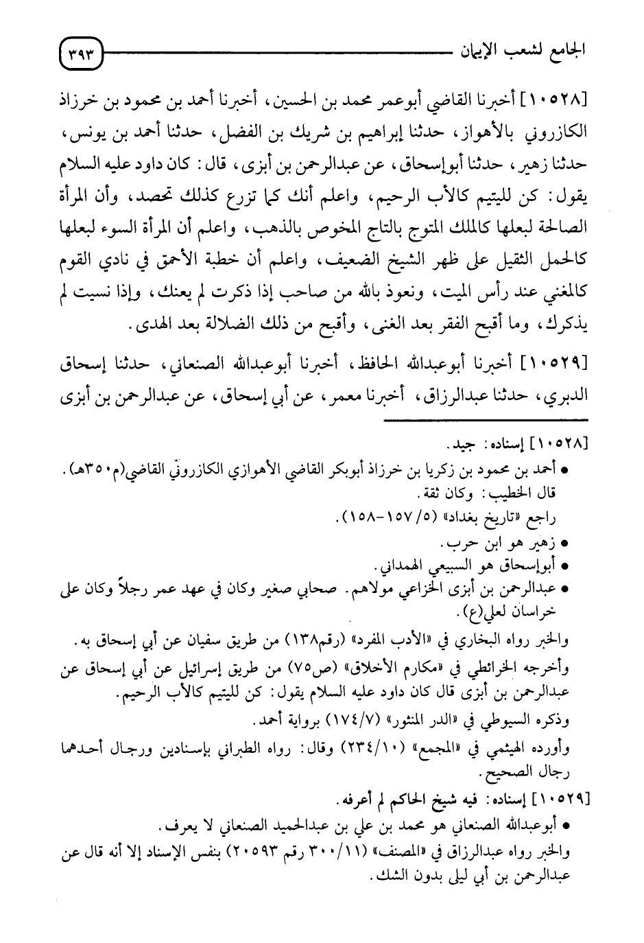 10528 - أَخْبَرَنَا الْقَاضِي أَبُو عُمَرَ مُحَمَّدُ بْنُ الْحُسَيْنِ، أَنَا أَحْمَدُ بْنُ مَحْمُودِ بْنِ خُرْزَادَ الْكَازَرُونِيُّ، بِالْأَهْوَازِ، ثَنَا إِبْرَاهِيمُ بْنُ شَرِيكٍ، ثَنَا أَحْمَدُ بْنُ الْفَضْلِ، ثَنَا أَحْمَدُ بْنُ يُونُسَ، ثَنَا زُهَيْرٌ، ثَنَا أَبُو إِسْحَاقَ، عَنْ عَبْدِ الرَّحْمَنِ بْنِ أَبْزَى، قَالَ: " كَانَ §دَاوُدُ عَلَيْهِ السَّلَامُ، يَقُولُ: كُنْ لِلْيَتِيمِ كَالْأَبِ الرَّحِيمِ، وَاعْلَمْ أَنَّكَ كَمَا تَزْرَعُ كَذَلِكَ تَحْصُدُ، وَإِنَّ الْمَرْأَةَ الصَّالِحَةَ لِبَعْلِهَا كَالْمَلِكِ الْمُتَوَّجِ بِالتَّاجِ الْمُحَوَّضِ بِالذَّهَبِ، وَاعْلَمْ أَنَّ الْمَرْأَةَ السُّوءَ لِبَعْلِهَا كَالْحِمْلِ الثَّقِيلِ عَلَى ظَهْرِ الشَّيْخِ الضَّعِيفِ، وَاعْلَمْ أَنَّ خُطْبَةَ الْأَحْمَقِ فِي نَادِي الْقَوْمِ كَالْمُغَنِّي عِنْدَ رَأْسِ الْمَيِّتِ، وَتَعَوَّذْ بِاللهِ مِنْ صَاحِبٍ إِذَا ذَكَرَتْ لَمْ يُعِنْكَ وَإِذَا نَسِيتَ لَمْ يَذْكُرْكَ، وَمَا أَقْبَحَ الْفَقْرَ بَعْدَ الْغِنَى، وَأَقْبَحُ مِنْ ذَلِكَ الضَّلَالَةُ بَعْدَ الْهُدَى "