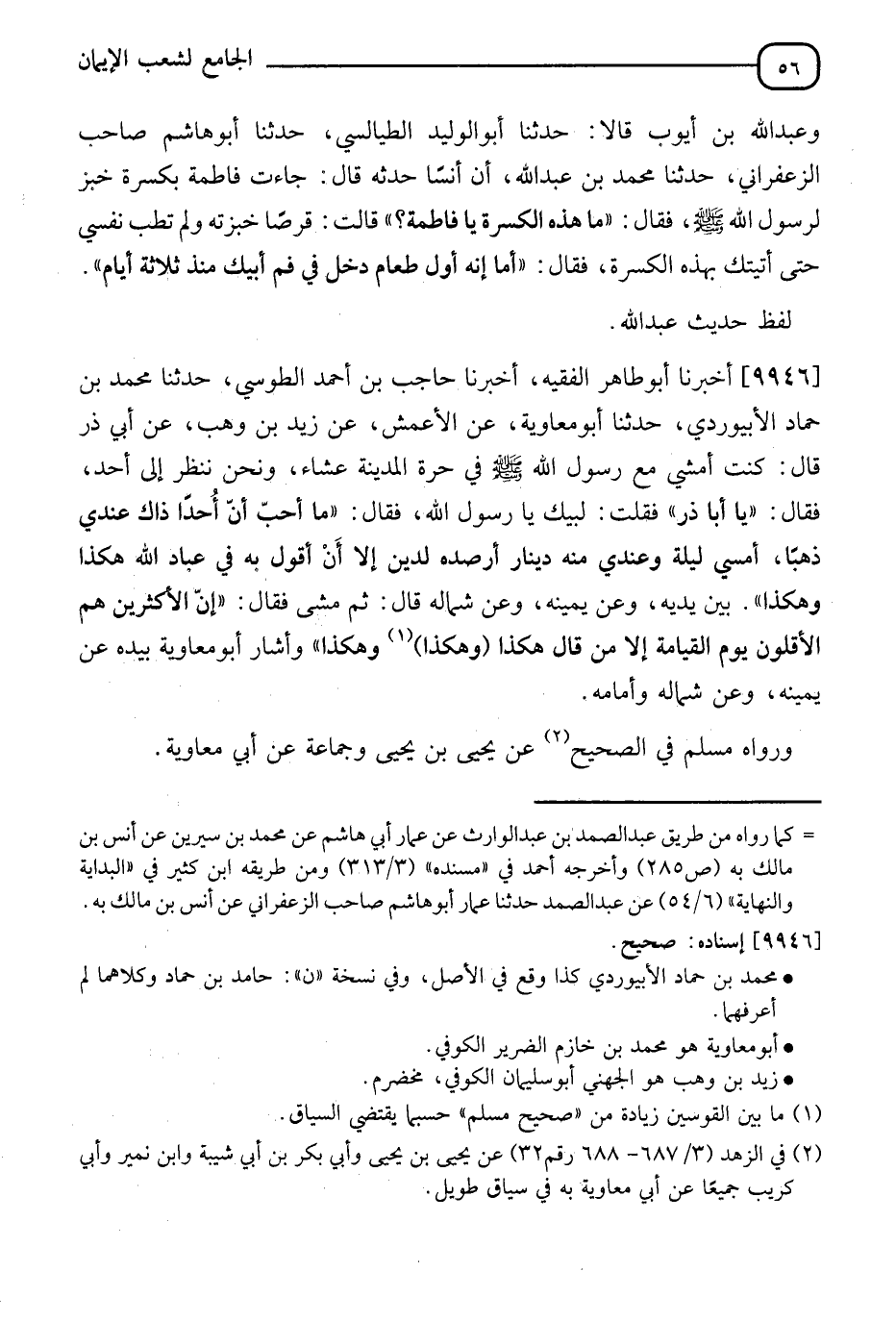 9946 - أَخْبَرَنَا أَبُو طَاهِرٍ الْفَقِيهُ , أَنَا حَاجِبُ بْنُ أَحْمَدَ الطُّوسِيُّ , ثَنَا مُحَمَّدُ بْنُ حَمَّادٍ الْأَبِيوَرْدِيُّ , ثَنَا أَبُو مُعَاوِيَةَ , عَنِ الْأَعْمَشِ , عَنْ زَيْدِ بْنِ وَهْبٍ , عَنْ أَبِي ذَرٍّ قَالَ: كُنْتُ أَمْشِي مَعَ رَسُولِ اللهِ صَلَّى اللَّهُ عَلَيْهِ وَسَلَّمَ فِي حَرَّةِ الْمَدِينَةِ عِشَاءً وَنَحْنُ نَنْظُرُ إِلَى أُحِدٍ , فَقَالَ: " يَا أَبَا ذَرٍّ ". فَقُلْتُ: لَبَّيْكَ يَا رَسُولَ اللهِ. فَقَالَ: §" مَا أُحِبُّ أَنَّ أُحُدًا ذَاكَ عِنْدِي ذَهَبًا , أَمْسَى لَيْلَةً عِنْدِي مِنْهُ دِينَارٌ أَرْصُدُهُ لِدَيْنٍ , إِلَّا أَنْ أَقُولَ بِهِ فِي عِبَادِ اللهِ هَكَذَا وَهَكَذَا بَيْنَ يَدَيْهِ , وَعَنْ يَمِينِهِ , وَعَنْ شِمَالِهِ " , قَالَ: ثُمَّ مَشَى , فَقَالَ: " إِنَّ الْأَكْثَرِينَ هُمُ الْأَقَلُّونَ يَوْمَ الْقِيَامَةِ إِلَّا مَنْ هَكَذَا وَهَكَذَا " وَأَشَارَ أَبُو مُعَاوِيَةَ بِيَدِهِ عَنْ يَمِينِهِ وَعَنْ شِمَالِهِ وَأَمَامَهُ رَوَاهُ مُسْلِمٌ فِي الصَّحِيحِ , عَنْ يَحْيَى بْنِ يَحْيَى , وَجَمَاعَةٌ عَنْ أَبِي مُعَاوِيَةَ , -[57]- وَأَخْرَجَهُ الْبُخَارِيُّ مِنْ أَوْجُهٍ عَنِ الْأَعْمَشِ