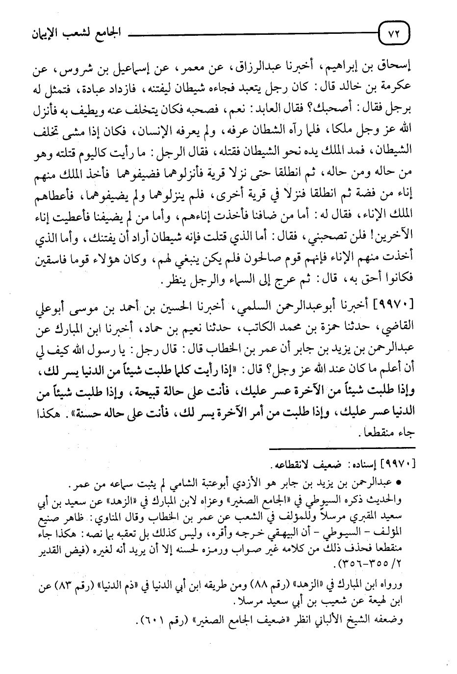 9970 - أَخْبَرَنَا أَبُو عَبْدِ الرَّحْمَنِ السَّلَمِيُّ , أَنَا الْحُسَيْنُ بْنُ مُحَمَّدِ بْنِ مُوسَى أَبُو عَلِيٍّ الْقَاضِي , ثَنَا حَمْزَةُ بْنُ مُحَمَّدٍ الْكَاتِبُ , ثَنَا نُعَيْمُ بْنُ حَمَّادٍ , أَنَا ابْنُ الْمُبَارَكِ , عَنْ عَبْدِ الرَّحْمَنِ بْنِ يَزِيدَ بْنِ جَابِرٍ: أَنَّ عُمَرَ بْنَ الْخَطَّابِ قَالَ: قَالَ رَجُلٌ: يَا رَسُولَ اللهِ , كَيْفَ لِي أَنْ أَعْلَمَ مَا كَانَ عِنْدَ اللهِ عَزَّ وَجَلَّ؟ قَالَ: §" إِذَا رَأَيْتَ كُلَّمَا طَلَبْتَ شَيْئًا مِنَ الدُّنْيَا يُسِّرَ لَكَ , وَإِذَا طَلَبْتَ شَيْئًا مِنْ أَمْرِ الْآخِرَةِ عُسِّرَ عَلَيْكَ فَأَنْتَ عَلَى حَالَةٍ قَبِيحَةٍ , وَإِذَا طَلَبْتَ شَيْئًا مِنَ الدُّنْيَا عُسِّرَ عَلَيْكَ , وَإِذَا طَلَبْتَ مِنْ أُمُورِ الْآخِرَةِ يُسِّرَ لَكَ فَأَنْتَ عَلَى حَالَةٍ حَسَنَةٍ " هَكَذَا جَاءَ مُنْقَطِعًا