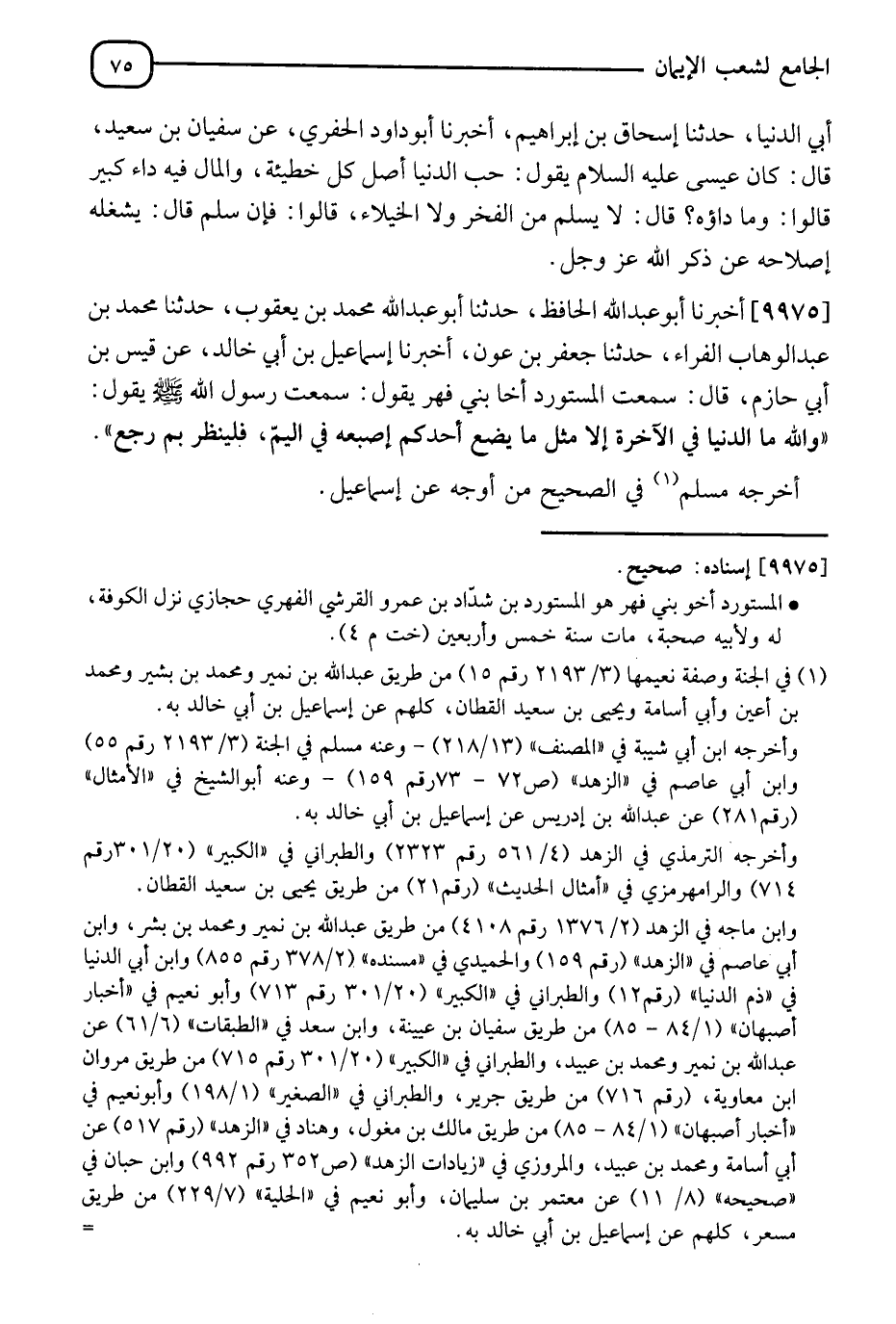 9975 - أَخْبَرَنَا أَبُو عَبْدِ اللهِ الْحَافِظُ , ثَنَا أَبُو عَبْدِ اللهِ مُحَمَّدُ بْنُ يَعْقُوبَ , ثَنَا مُحَمَّدُ بْنُ عَبْدِ الْوَهَّابِ الْفَرَّاءُ , أَنَا جَعْفَرُ بْنُ عَوْنٍ , أَنَا إِسْمَاعِيلُ بْنُ أَبِي خَالِدٍ , عَنْ قَيْسِ بْنِ أَبِي حَازِمٍ , قَالَ: سَمِعْتُ الْمُسْتَوْرِدَ , أَخَا بَنِي فِهْرٍ يَقُولُ: سَمِعْتُ رَسُولَ اللهِ صَلَّى اللَّهُ عَلَيْهِ وَسَلَّمَ يَقُولُ: " وَاللهِ §مَا الدُّنْيَا فِي الْآخِرَةِ إِلَّا مِثْلُ مَا يَضَعُ أَحَدُكُمْ أُصْبُعَهُ فِي الْيَمِّ , فَلْيَنْظُرْ بِمَ يَرْجِعُ " أَخْرَجَهُ مُسْلِمٌ فِي الصَّحِيحِ مِنْ أَوْجُهٍ عَنْ إِسْمَاعِيلَ